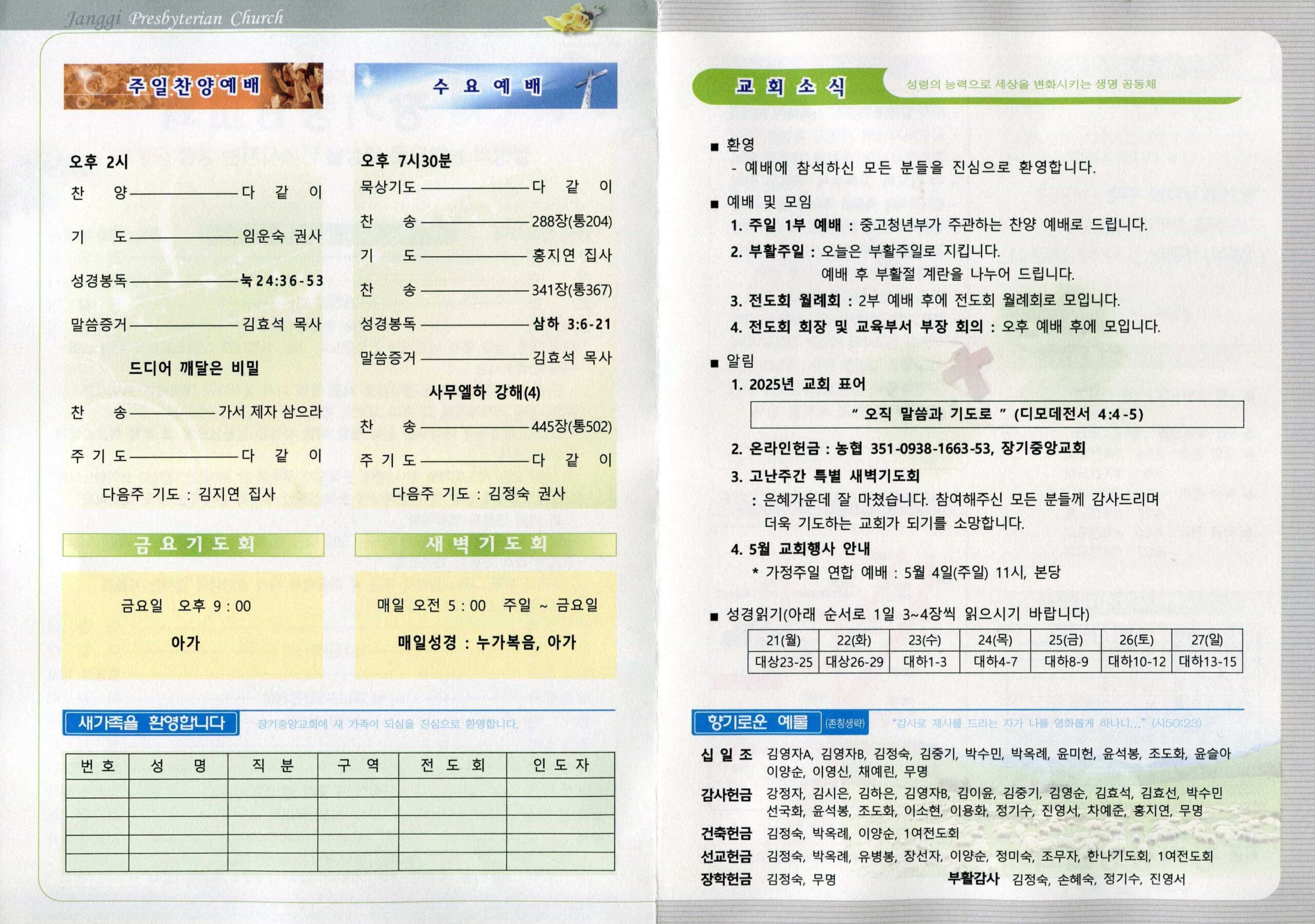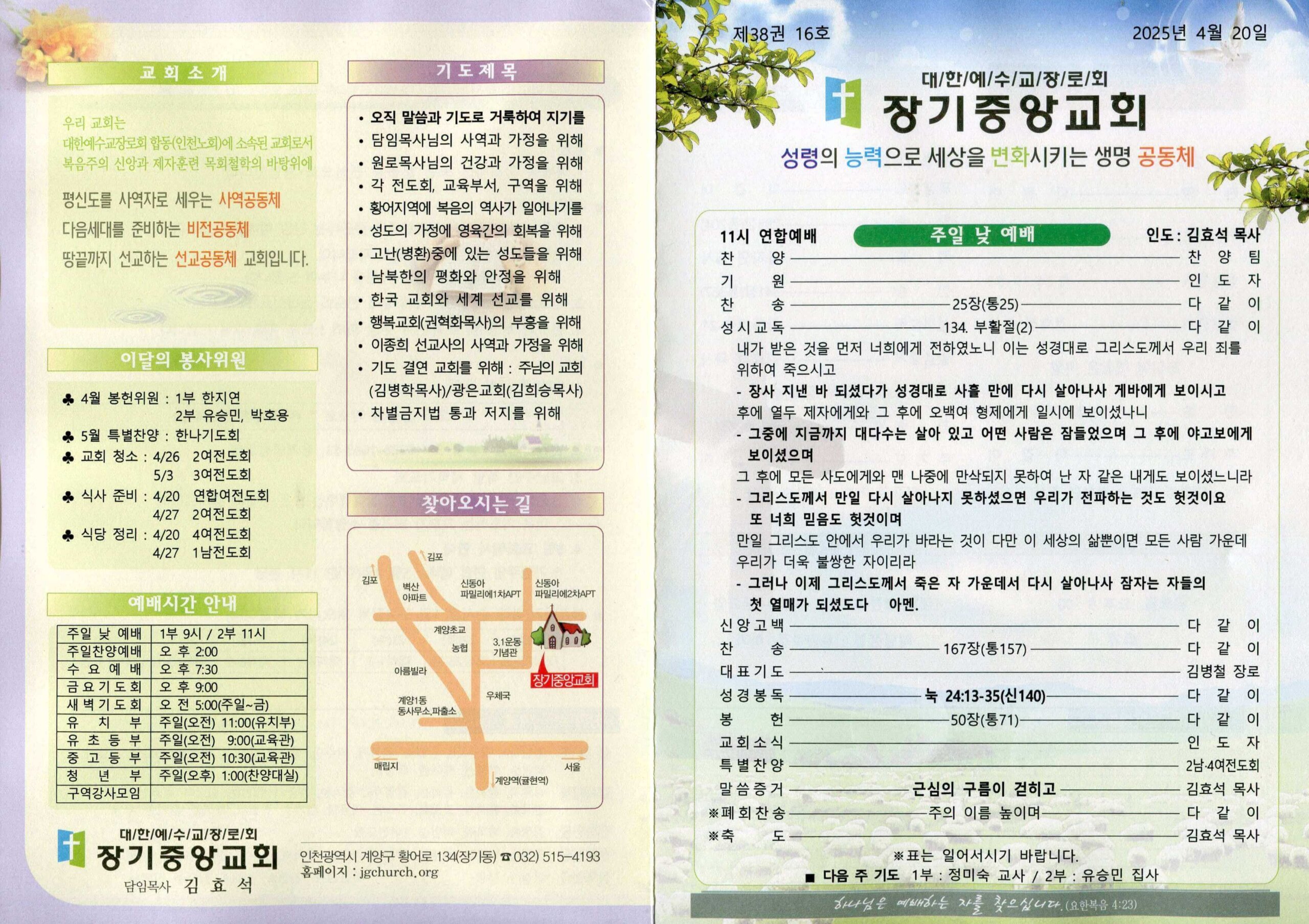 장기중앙교회 주보 2025년 4월 20일 – 예배 안내 및 소식