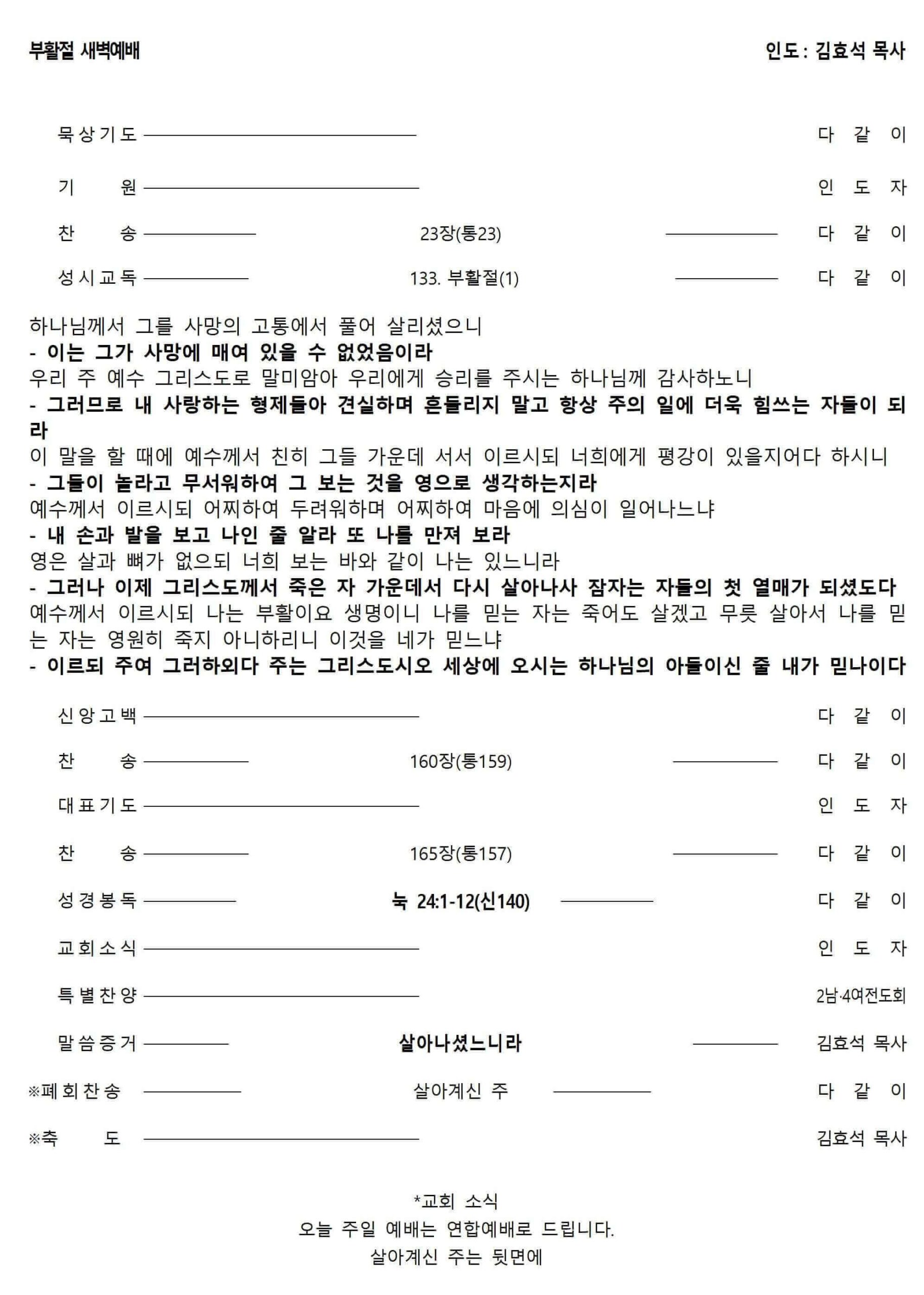 장기중앙교회 부활주일 새벽예배주보 2025년 4월 20일