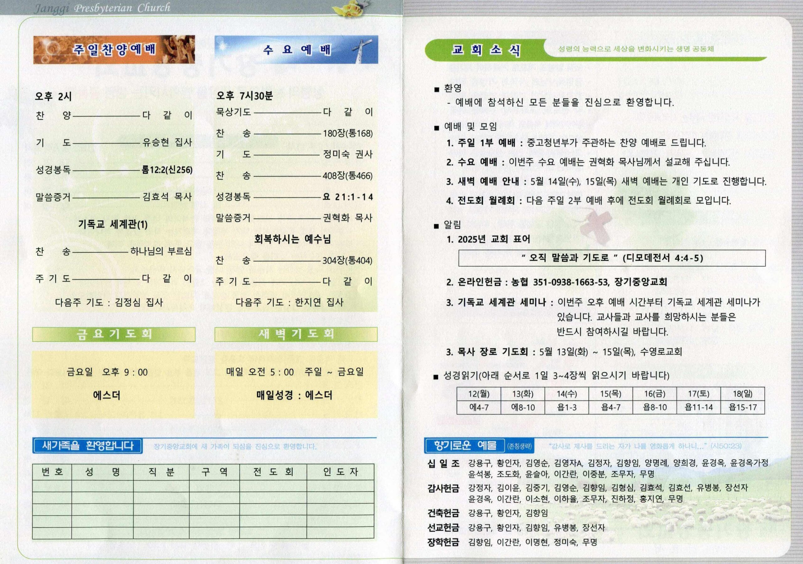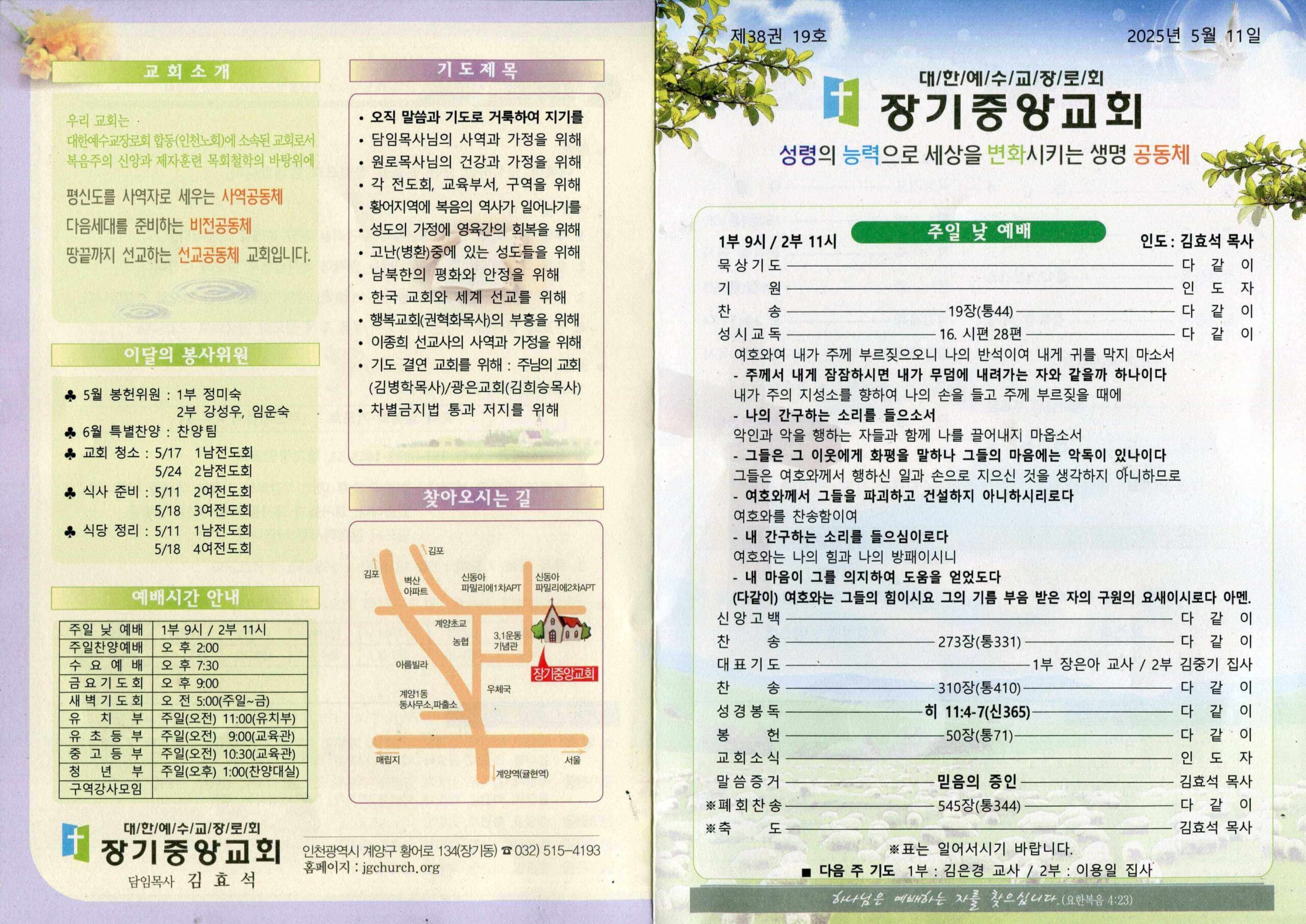 장기중앙교회 주보 2025년 5월 11일 – 예배 안내 및 소식