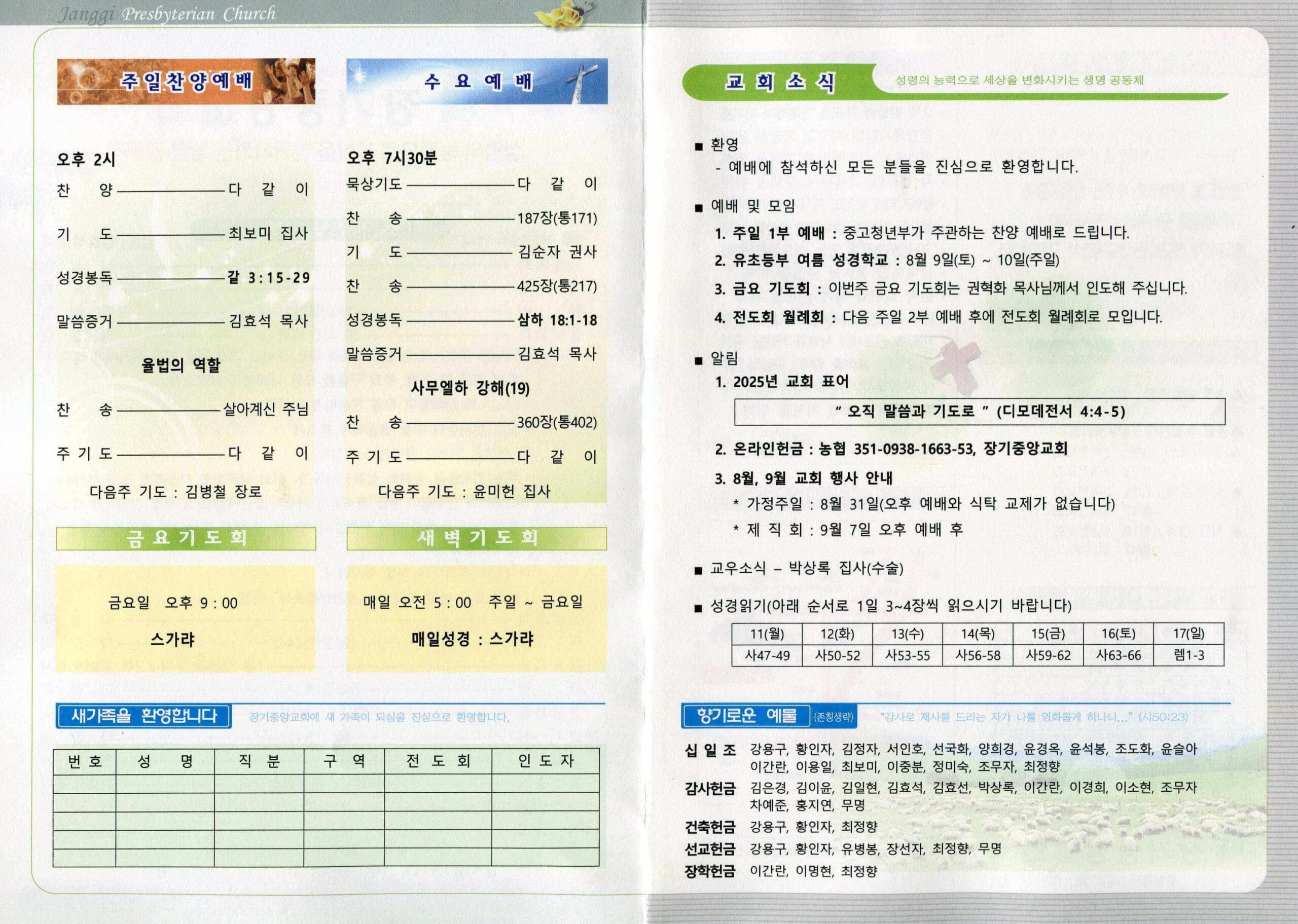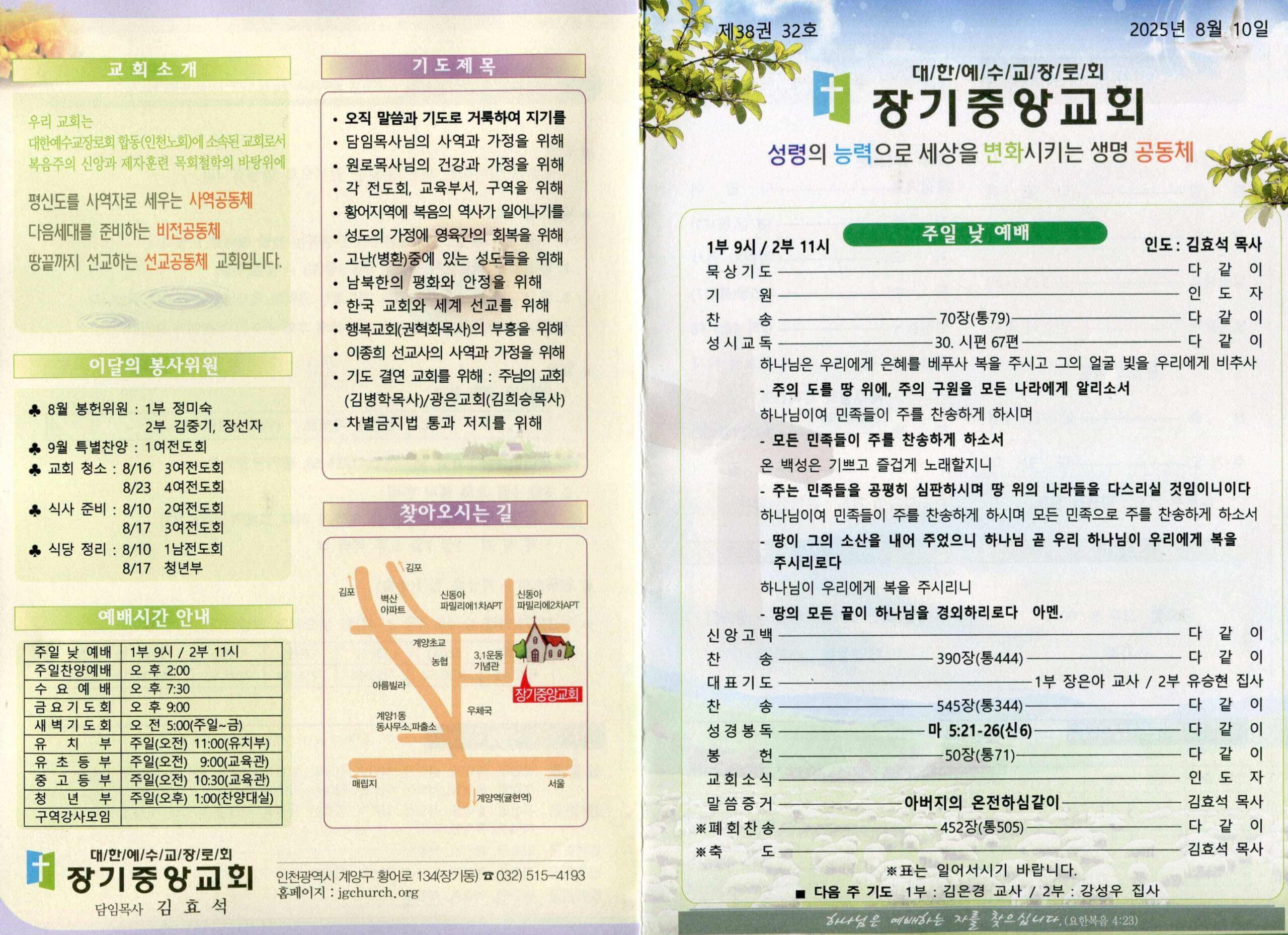 장기중앙교회 주보 2025년 8월 10일 – 예배 안내 및 소식