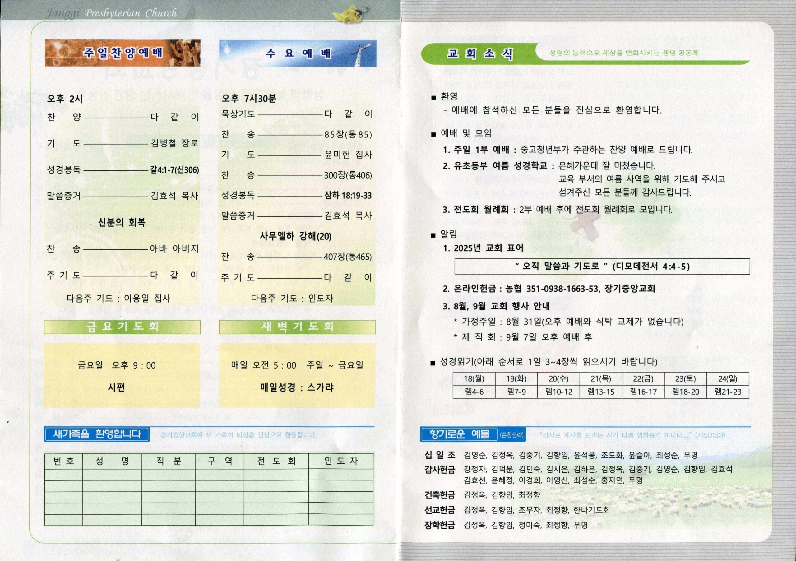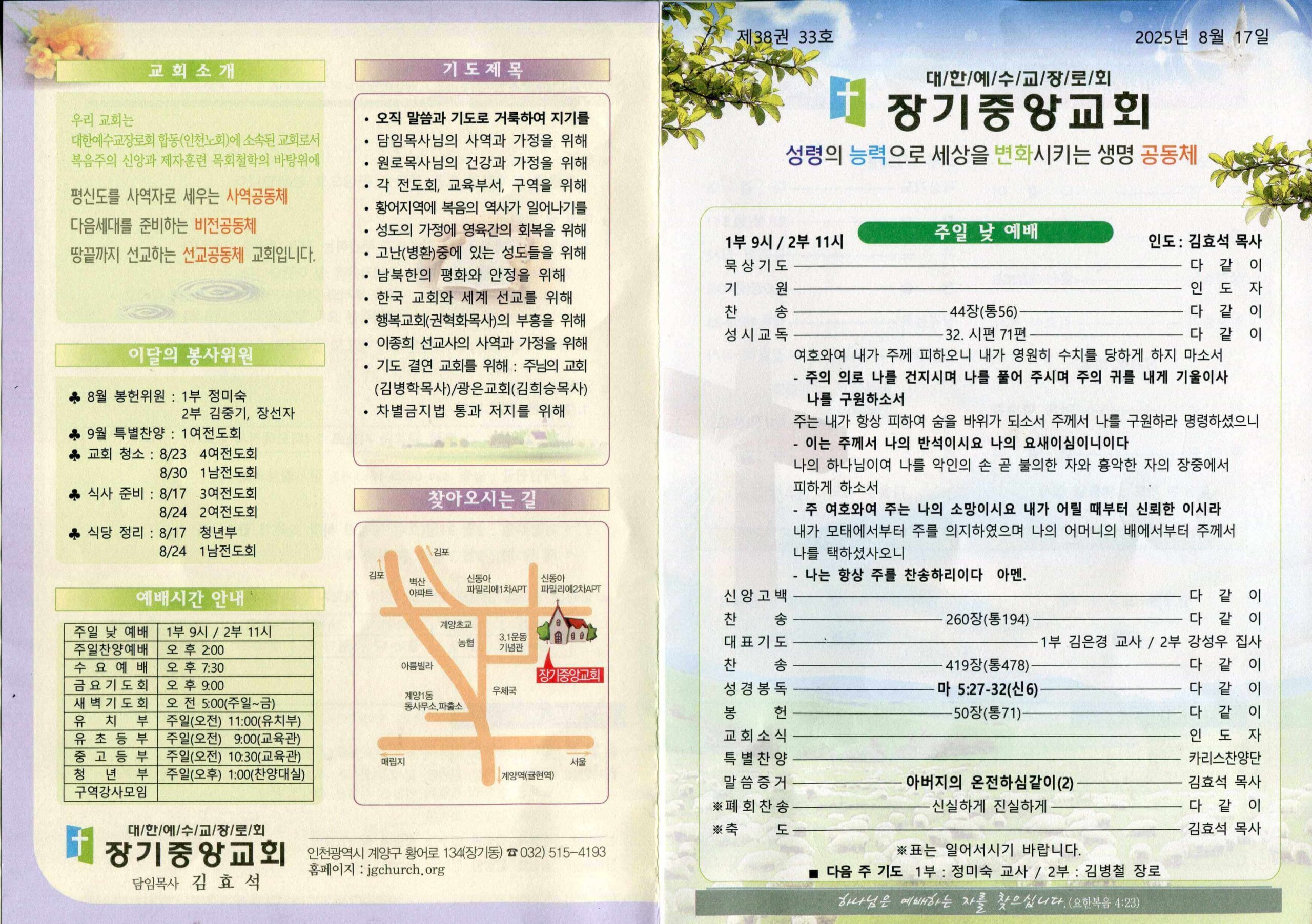 장기중앙교회 주보 2025년 8월 17일 – 예배 안내 및 소식