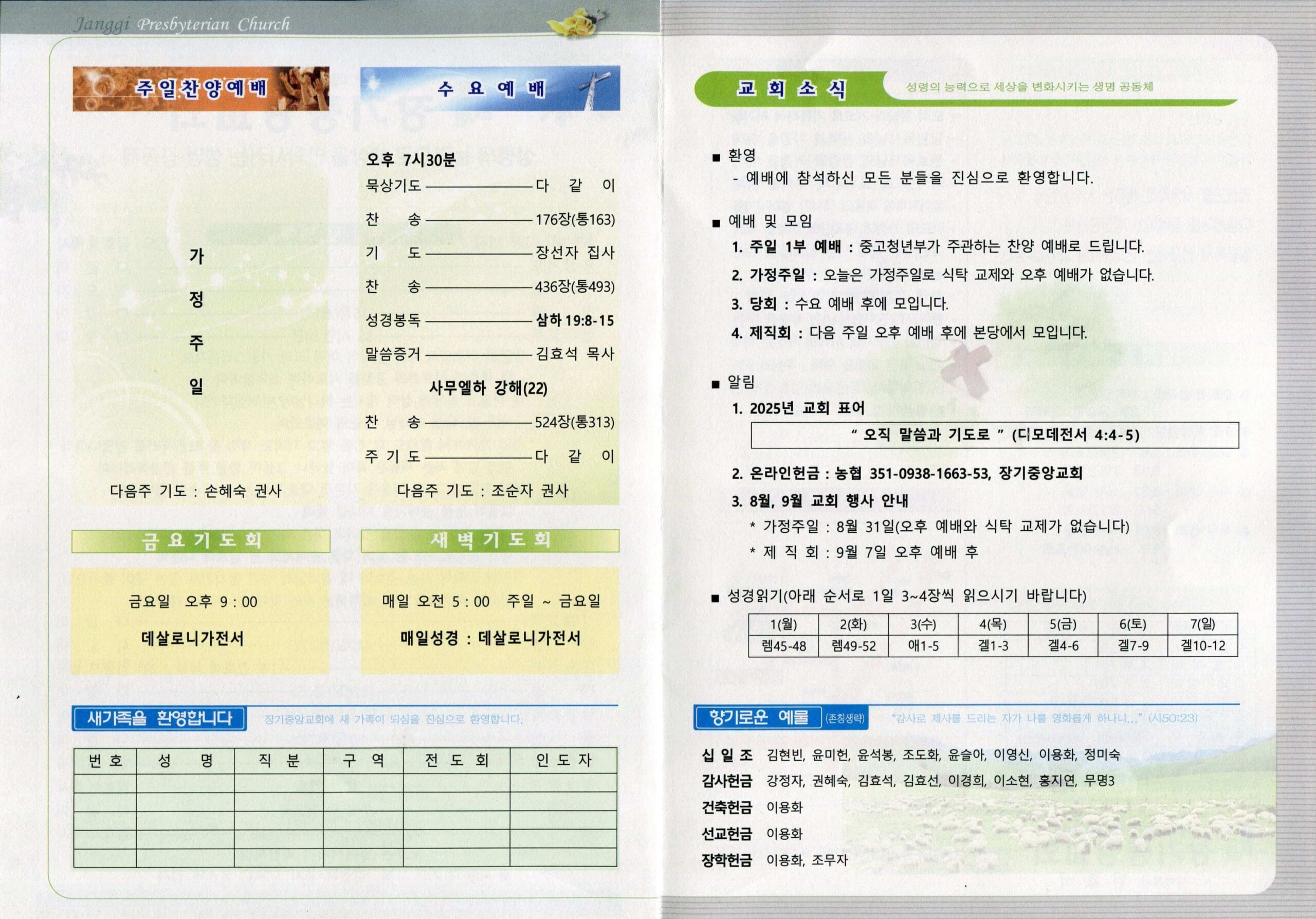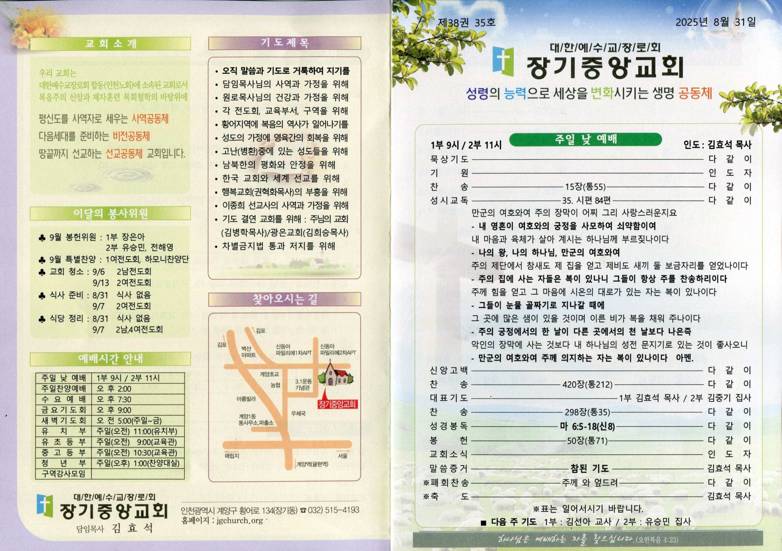 장기중앙교회 주보 2025년 8월 31일 – 예배 안내 및 소식