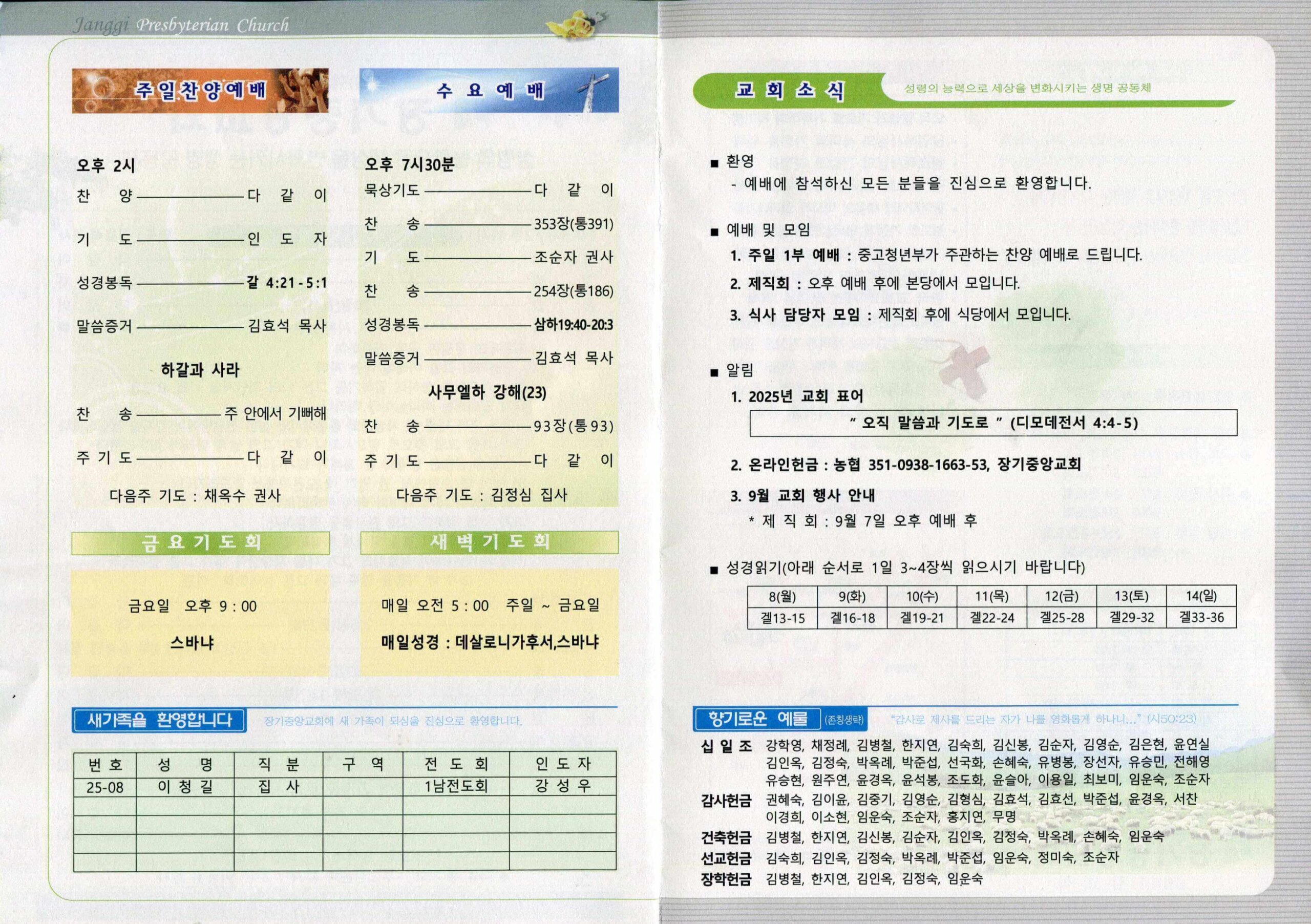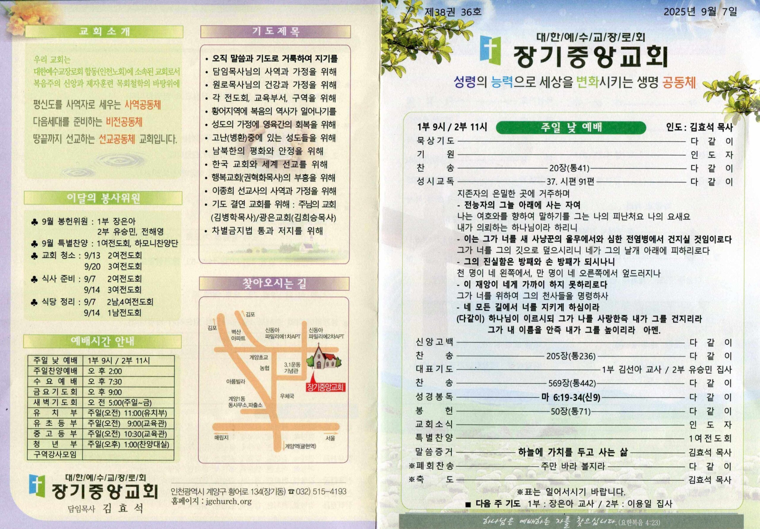 장기중앙교회 주보 2025년 9월 7일 – 예배 안내 및 소식