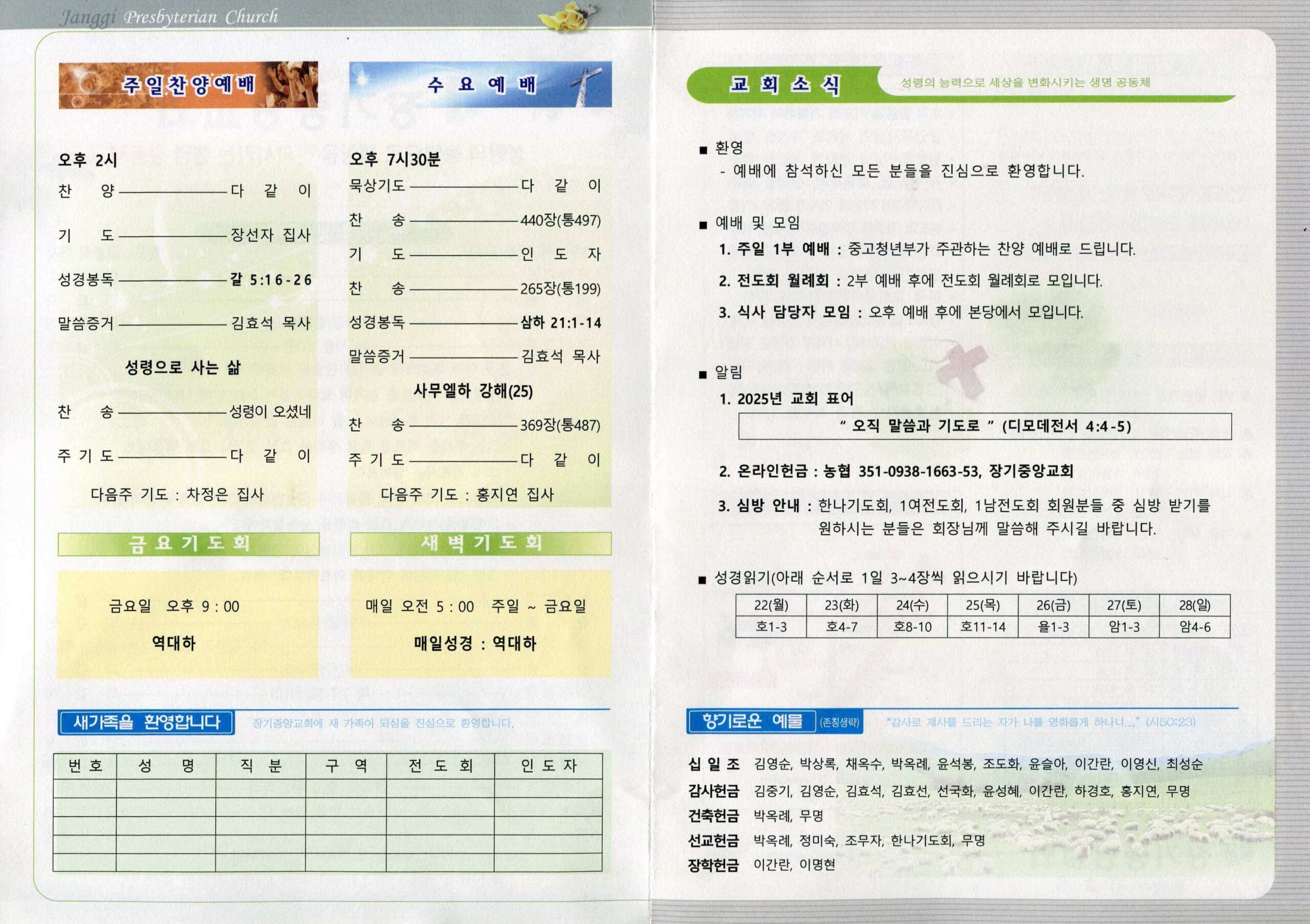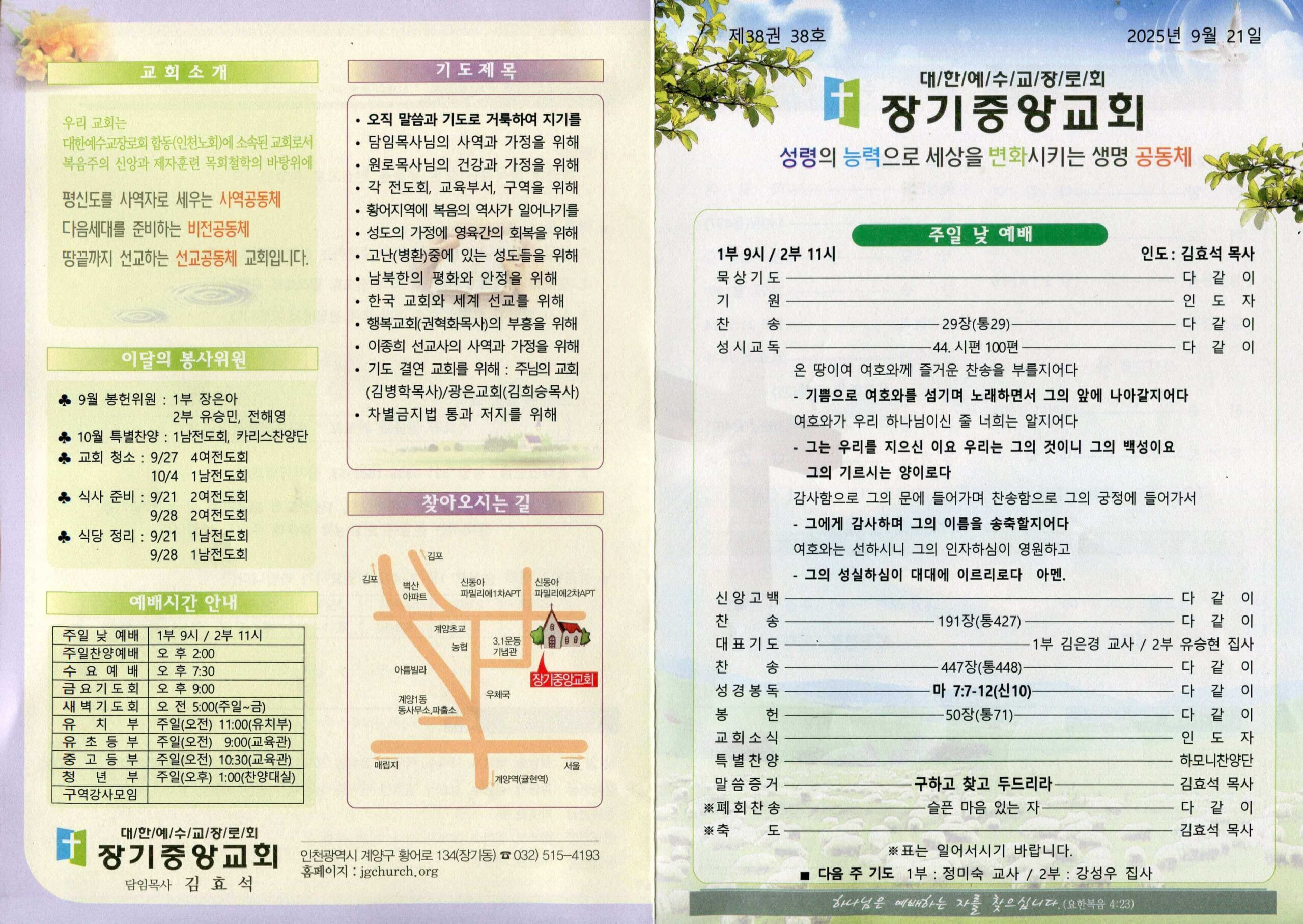장기중앙교회 주보 2025년 9월 21일 – 예배 안내 및 소식
