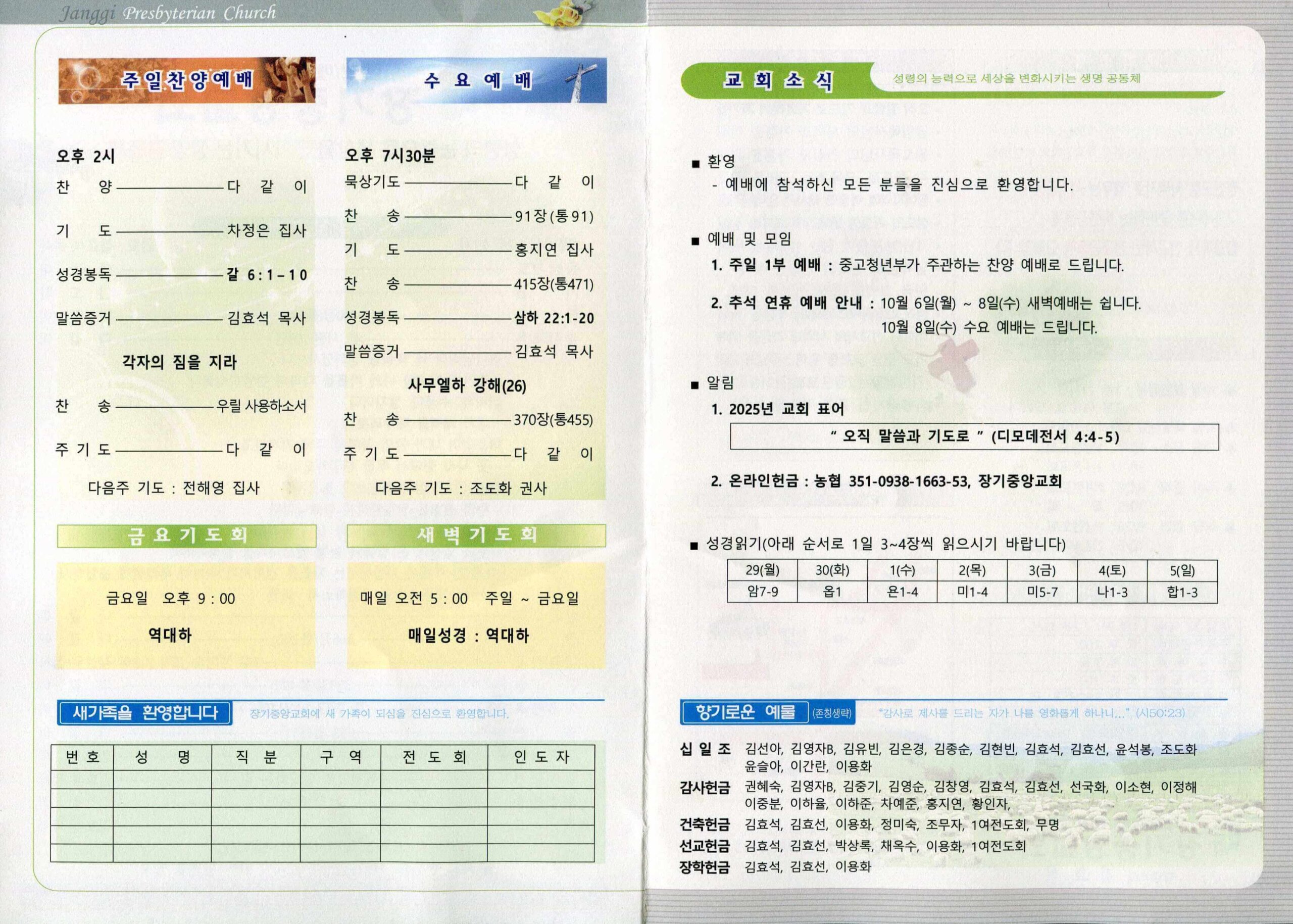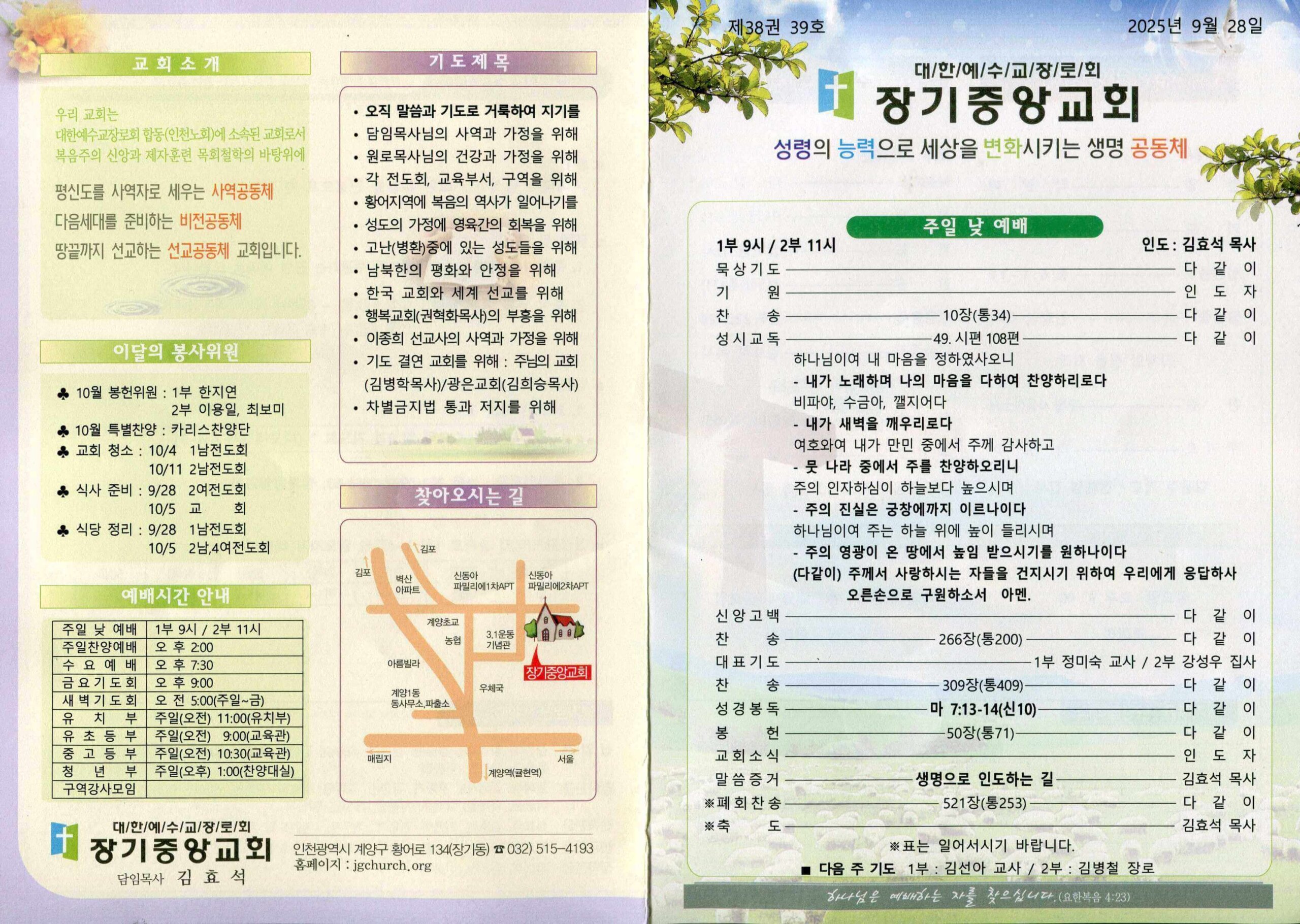 장기중앙교회 주보 2025년 9월 28일 – 예배 안내 및 소식