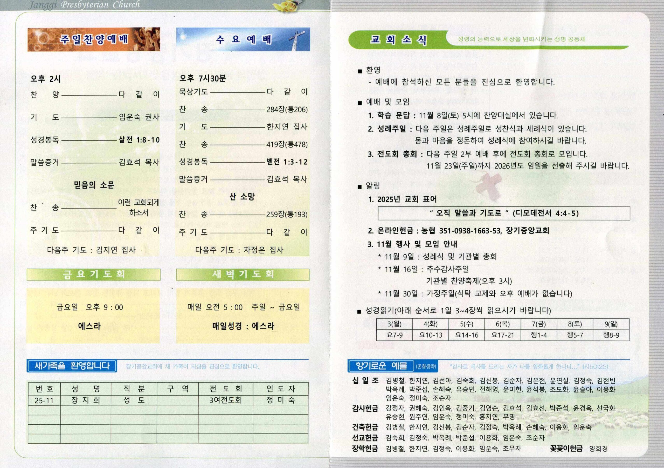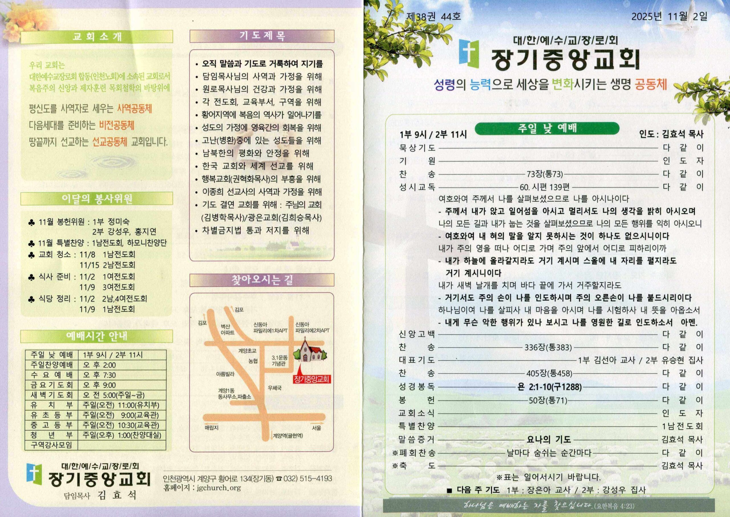 장기중앙교회 주보 2025년 11월 2일 – 예배 안내 및 소식