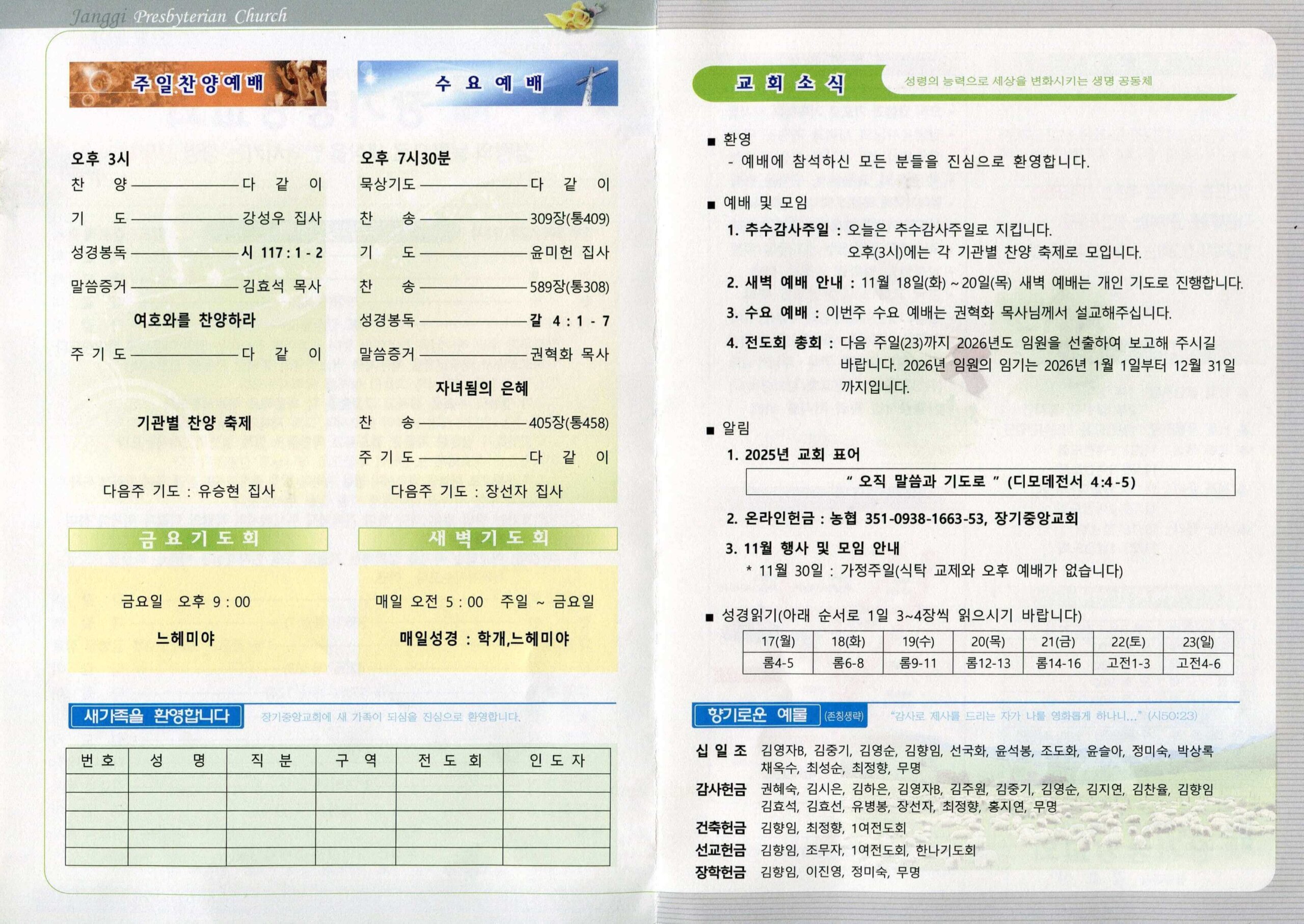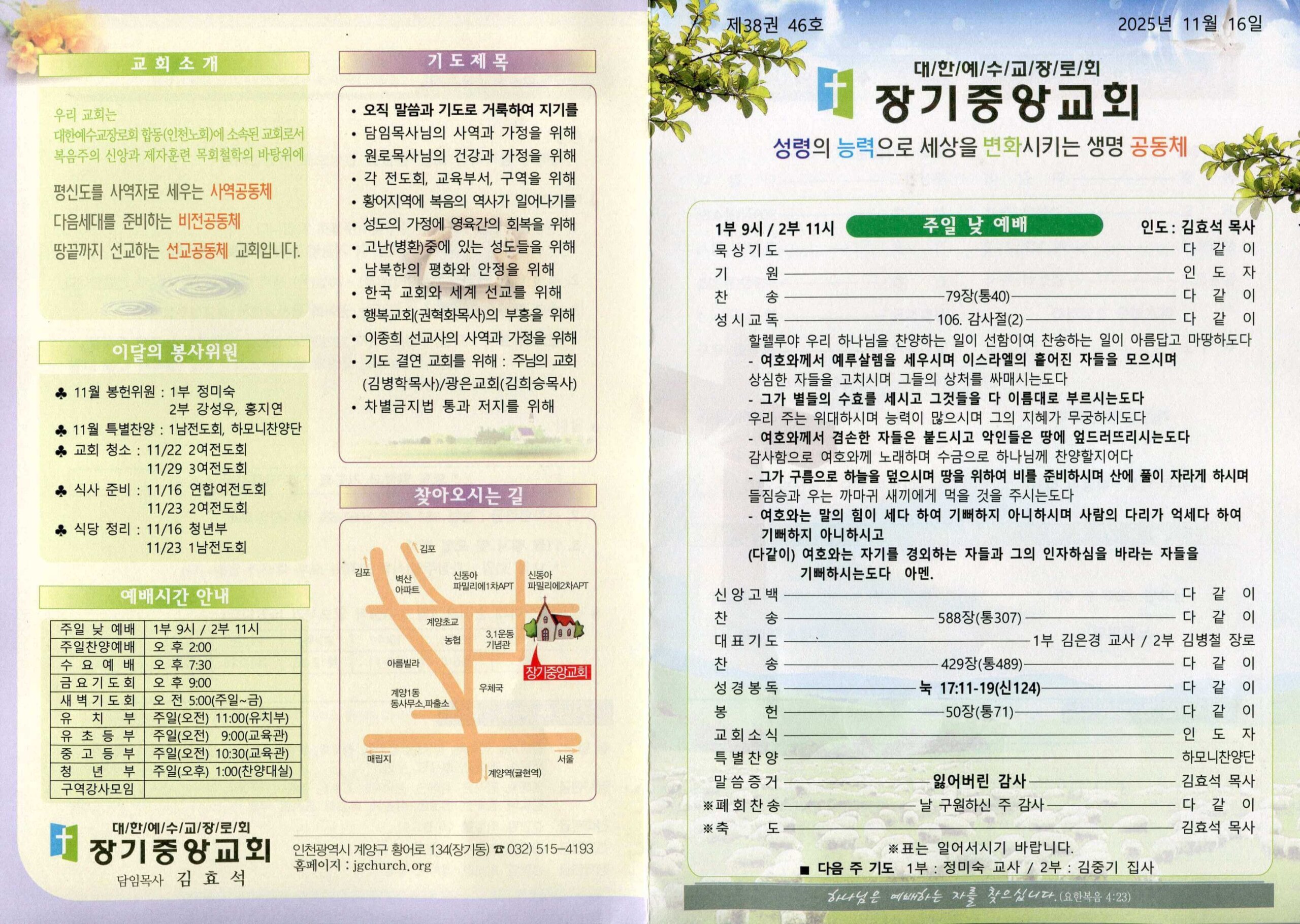장기중앙교회 주보 2025년 11월 16일 – 예배 안내 및 소식