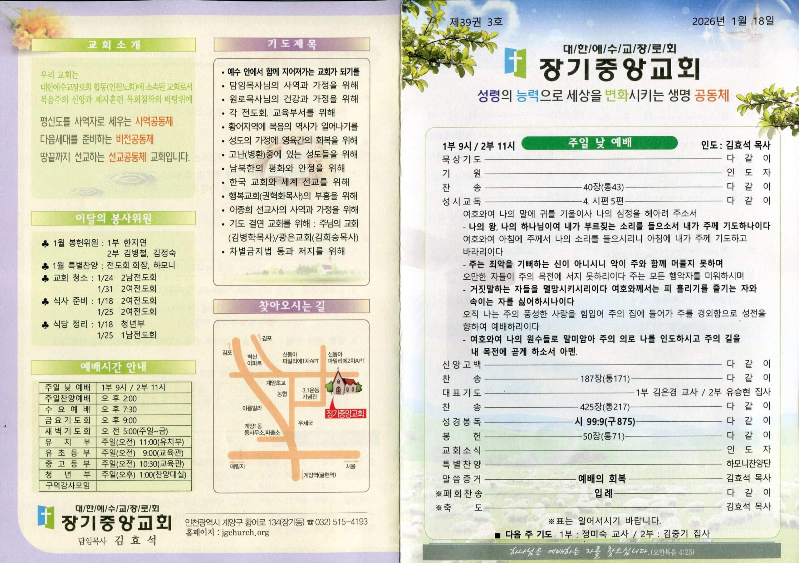 2026년 1월 18일 주일, ‘예배의 회복’을 통해 하나님의 임재를 경험하는 복된 날 되시길 소망합니다.