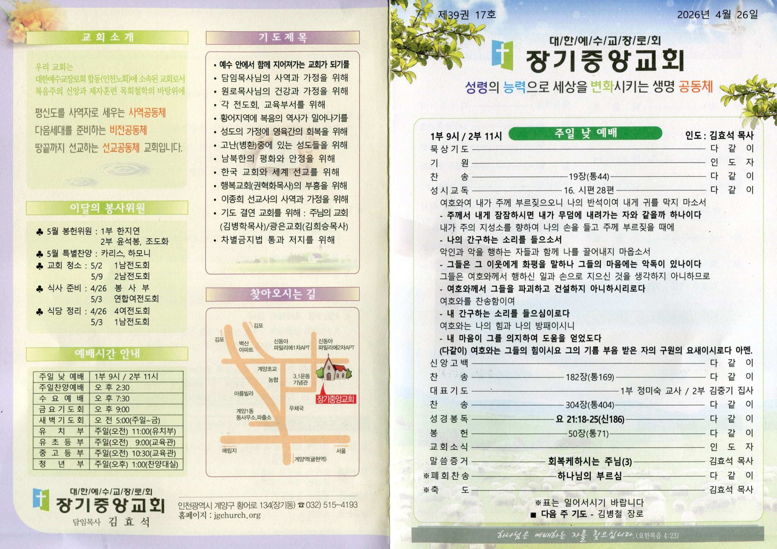 2026년 4월 26일 주일, ‘회복케 하시는 주님(3)’ 말씀을 통해 우리를 다시 사명의 자리로 부르시는 주님의 세밀한 사랑을 경험하시길 소망합니다. 아울러 다음 주에 진행될 ‘가정주일 연합 예배’ 소식도 함께 확인해 주시기 바랍니다.