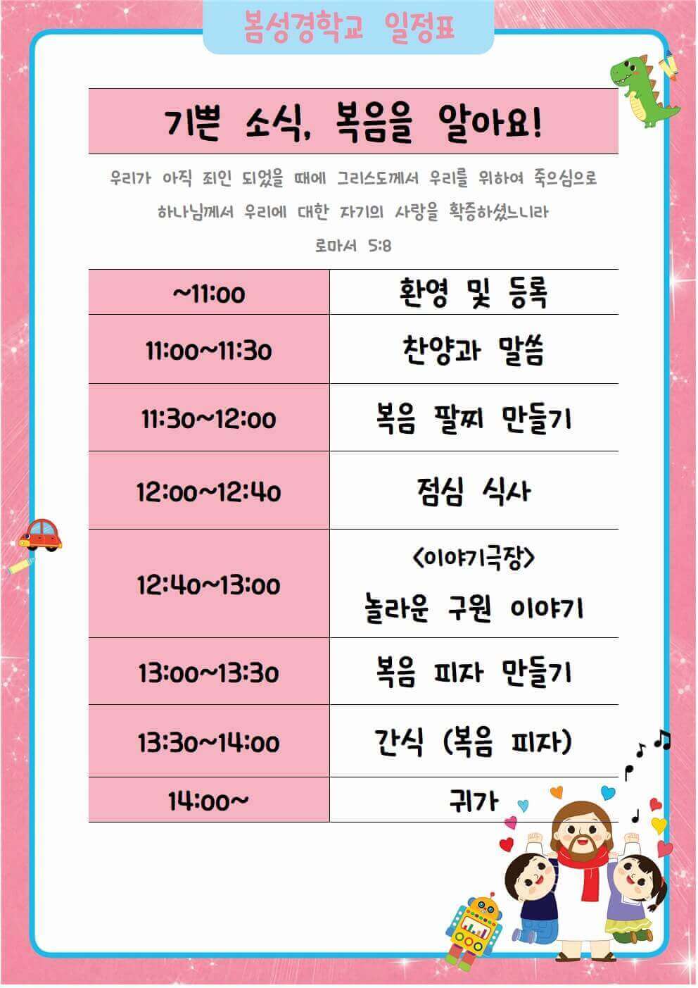장기중앙교회 유치부에서 2025년 봄 성경학교를 개최합니다! 이번 성경학교의 주제는 “기쁜 소식, 복음을 알아요!(로마서 5장 8절)”로, 아이들이 하나님의 사랑과 복음의 기쁜 소식을 쉽고 재미있게 배울 수 있도록 준비했습니다.