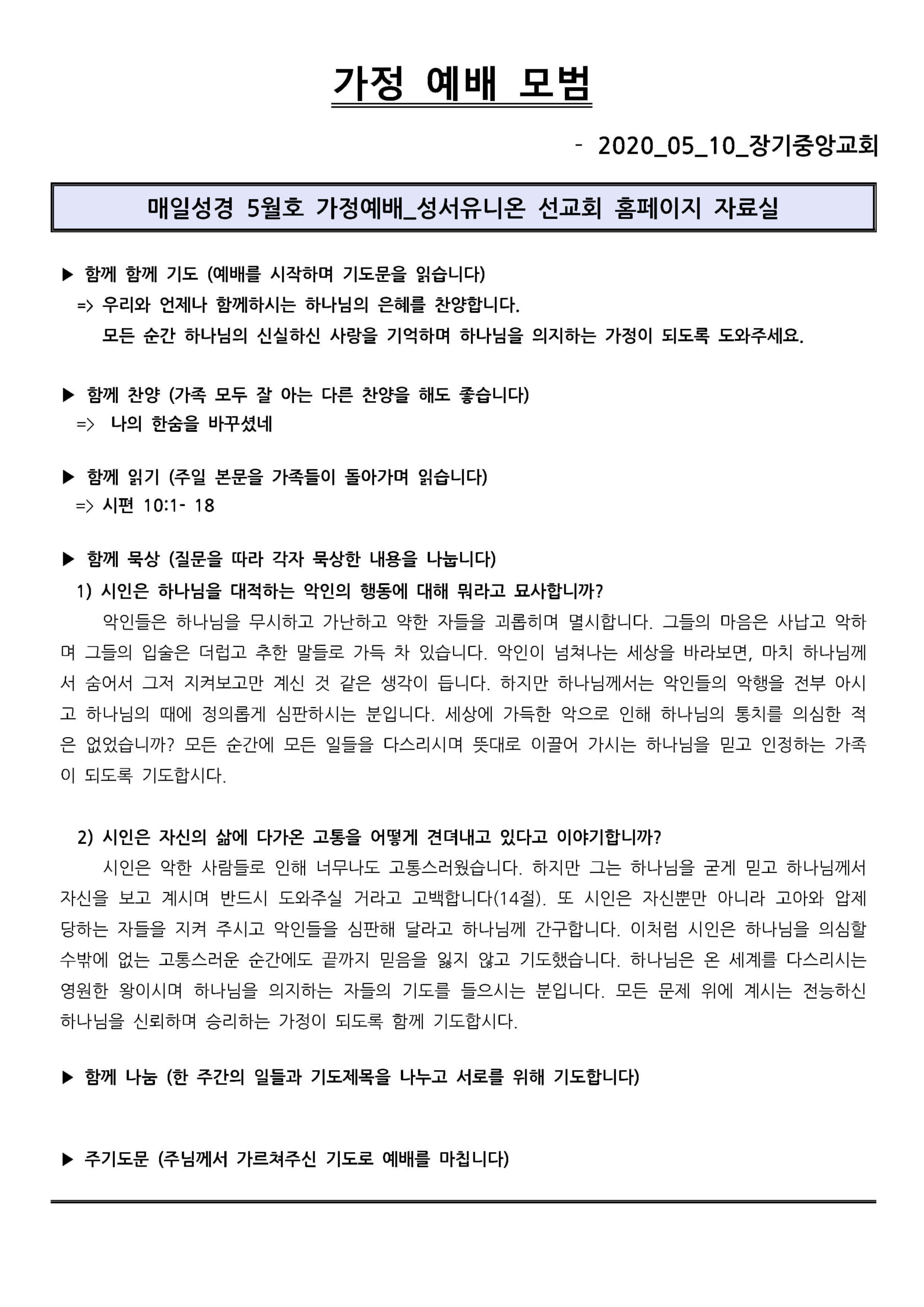 2020년 5월 10일 가정 예배 모범지