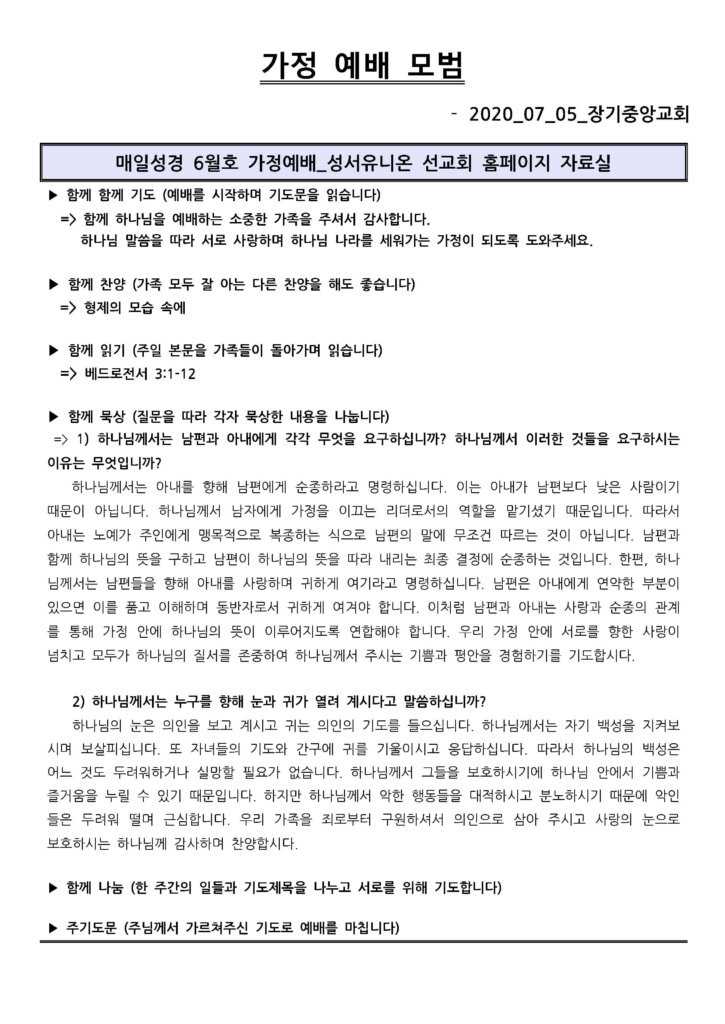 2020년 7월 5일 가정 예배 모범지