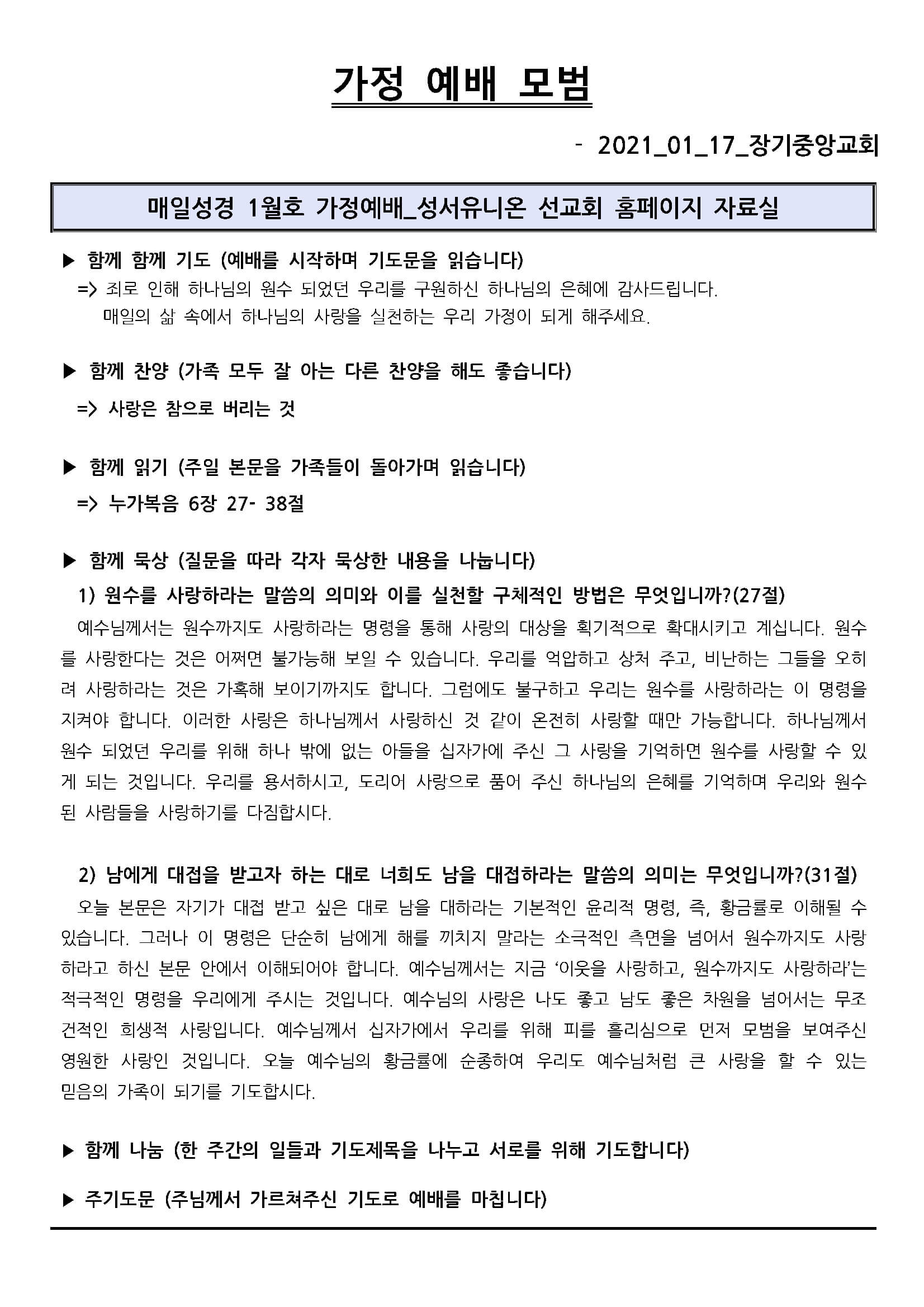 2021년 01월 17일 가정 예배 모범지