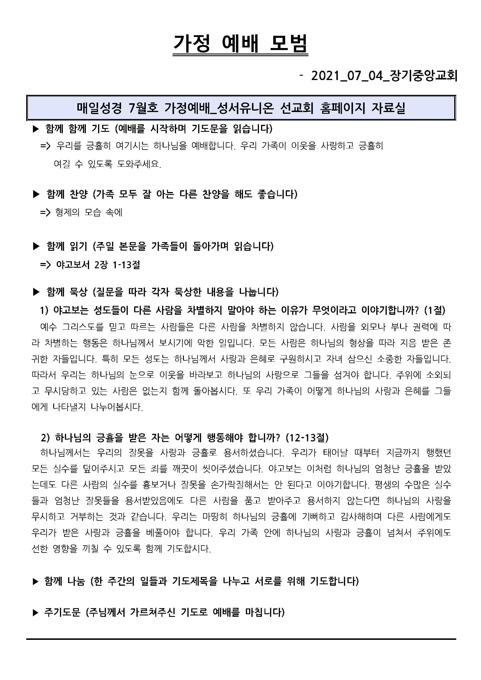 2021년 7월 4일 가정 예배 모범지