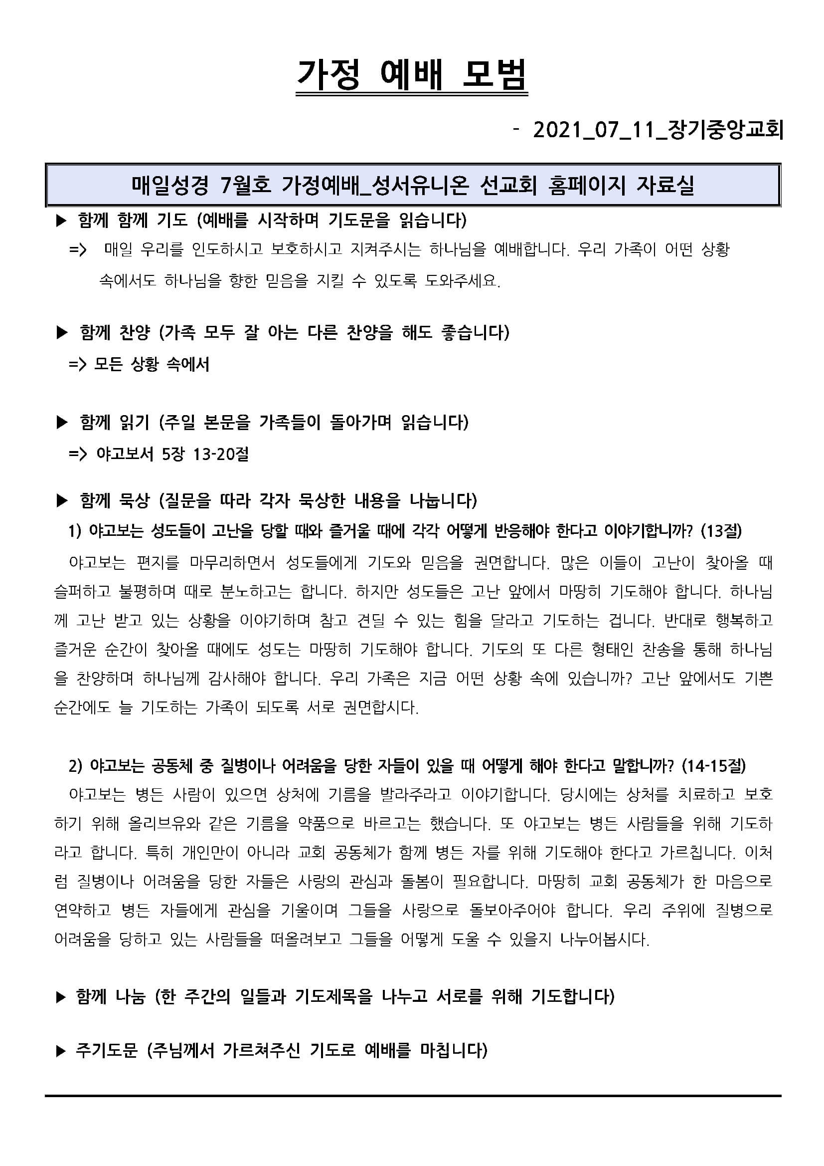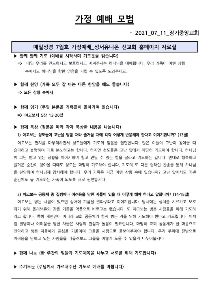 2021년 7월 11일 가정 예배 모범지