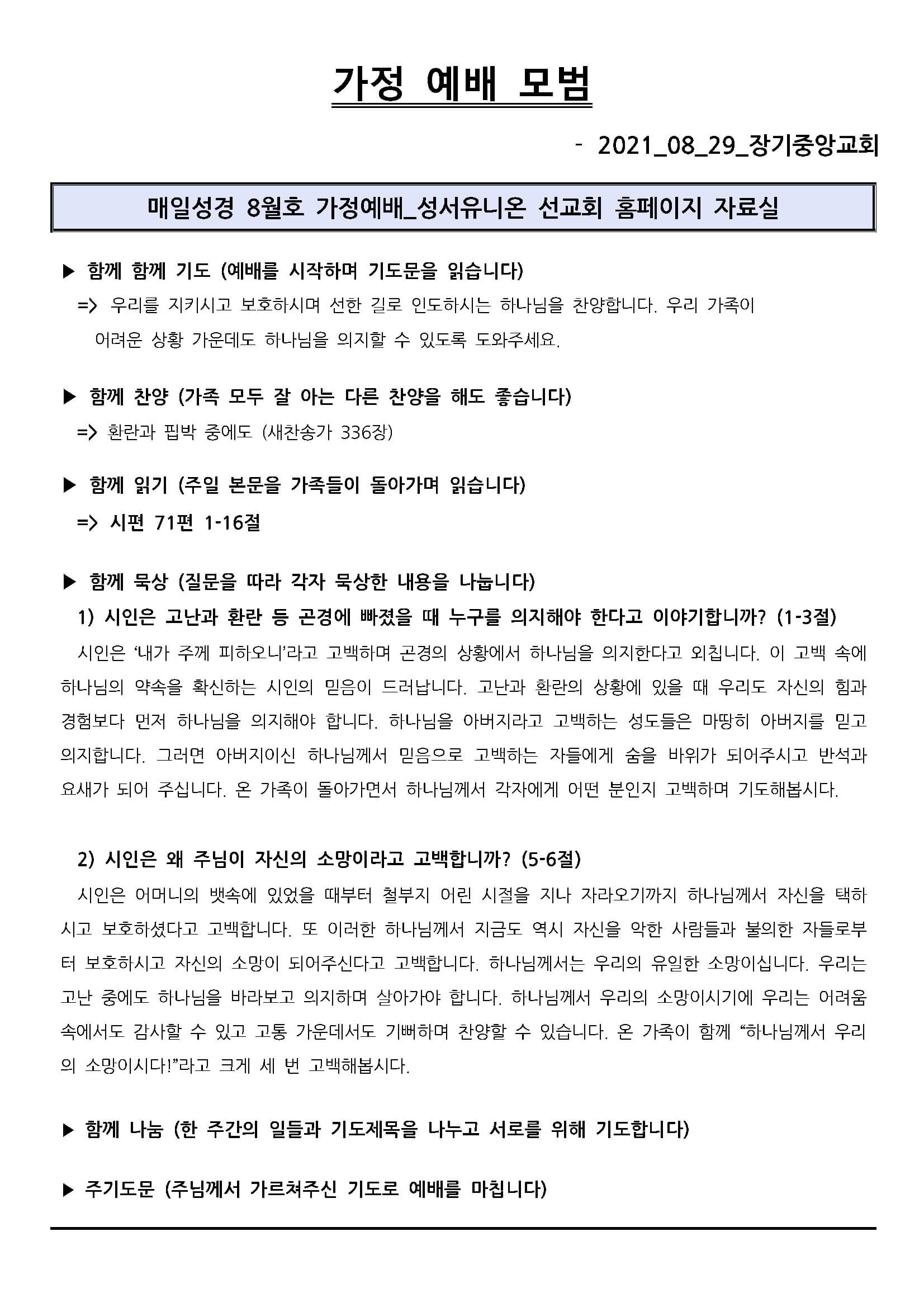 2021년 8월 29일 가정 예배 모범지