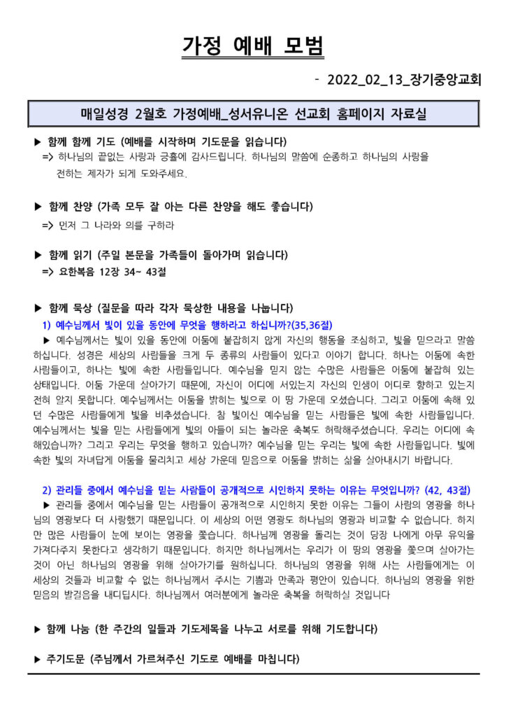 2022년 2월 13일 가정 예배 모범지