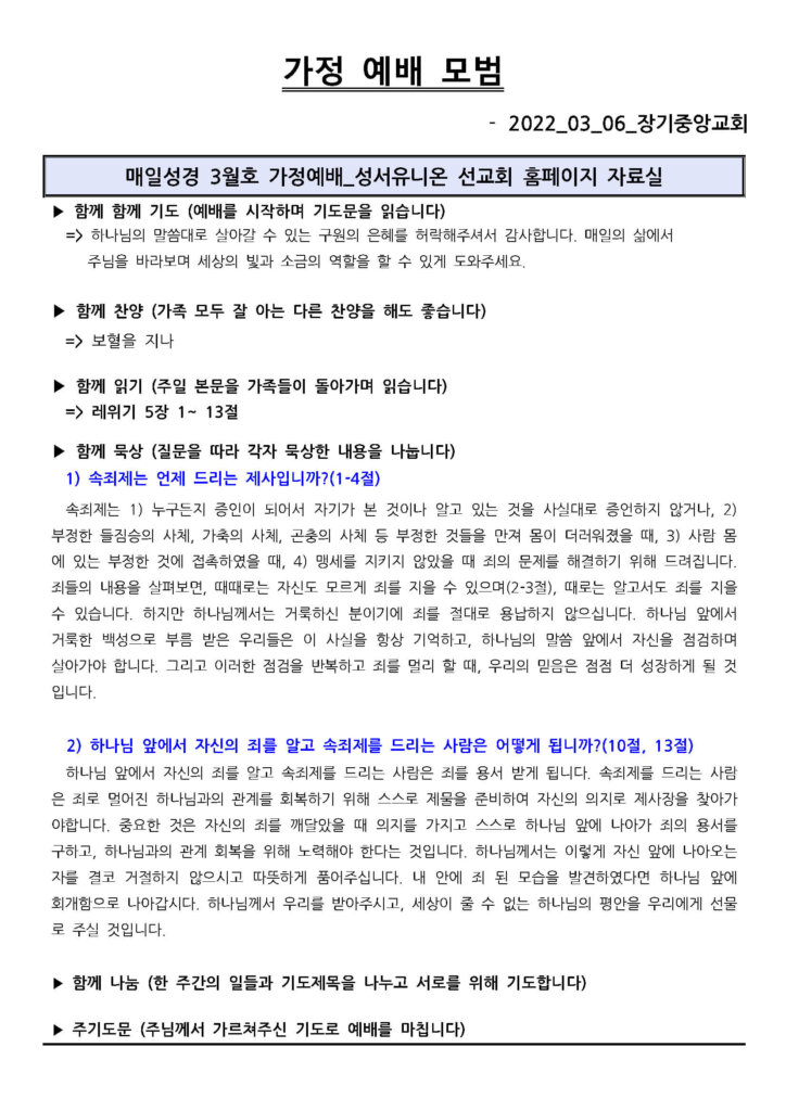 2022년 3월 6일 가정 예배 모범지