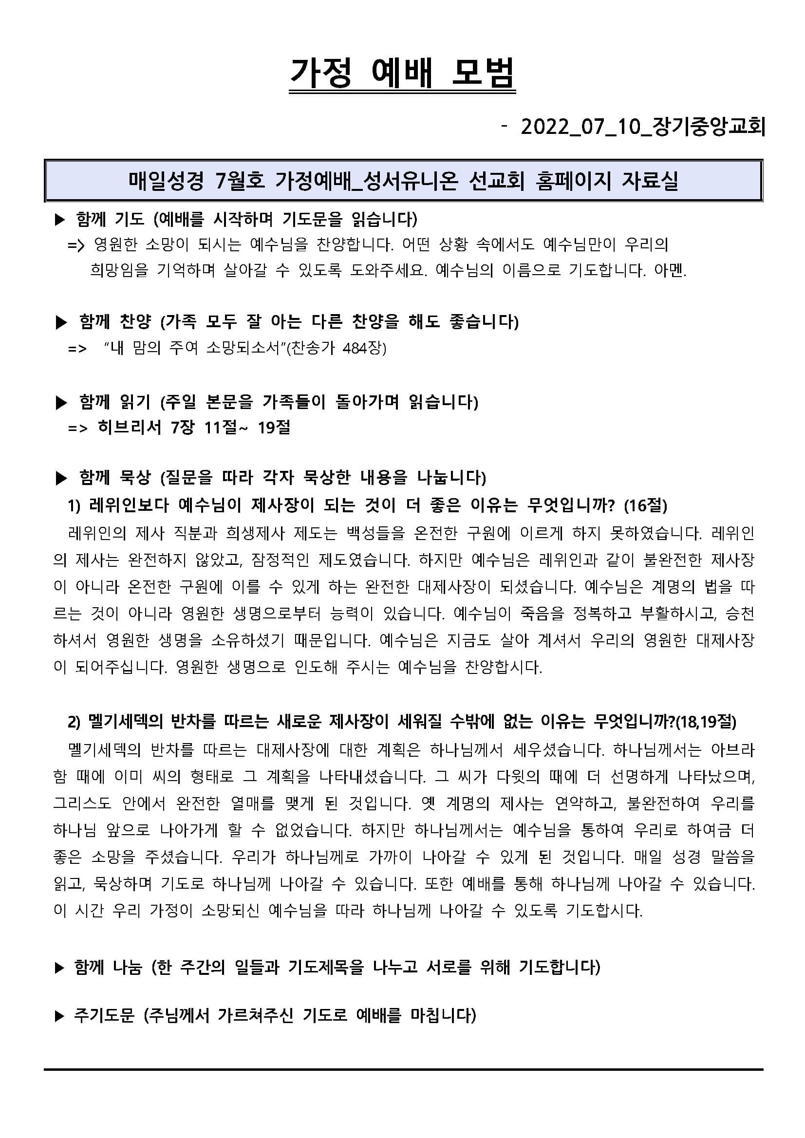 2022년 7월 10일 가정 예배 모범지