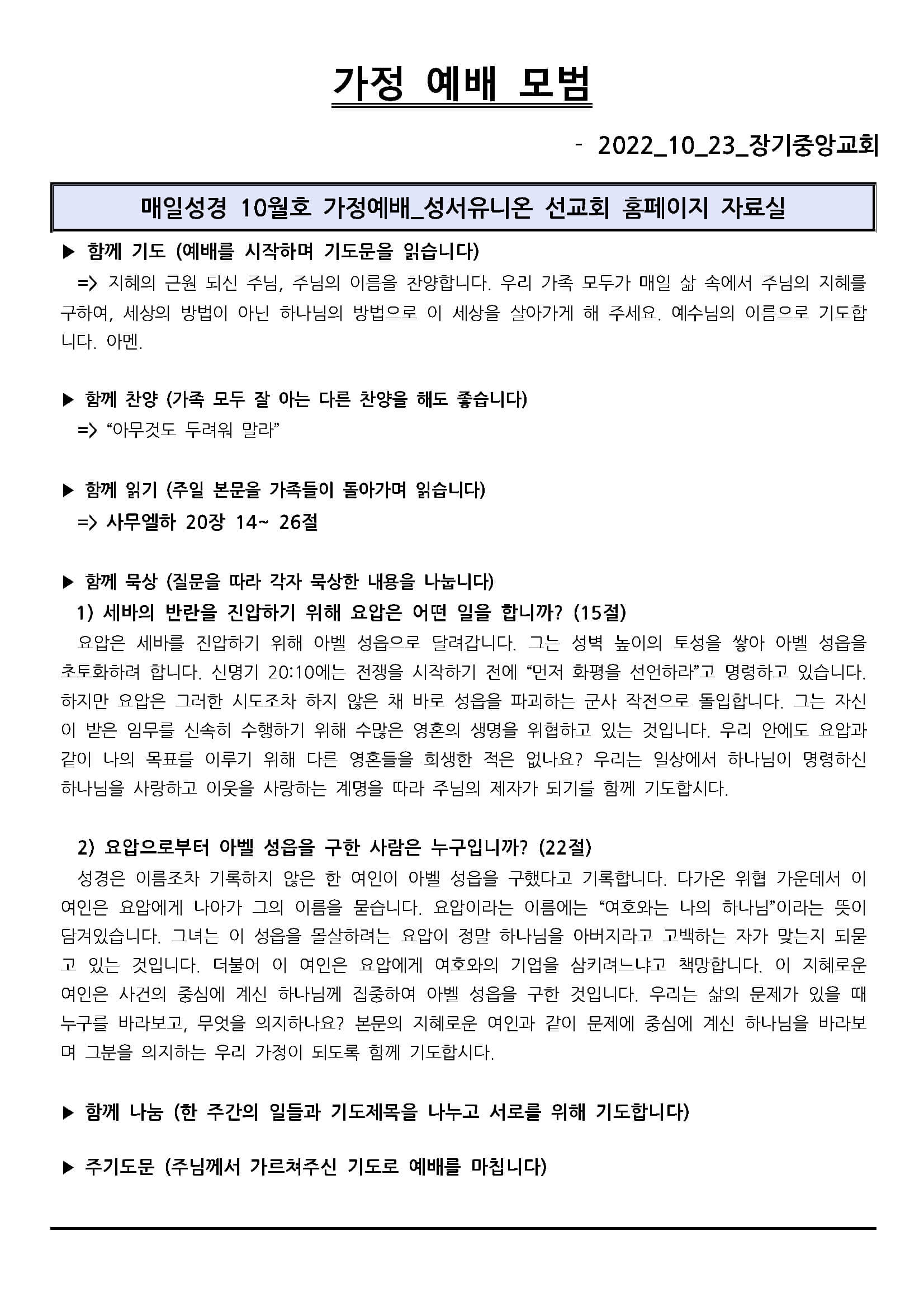 2022년 10월 23일 가정 예배 모범지