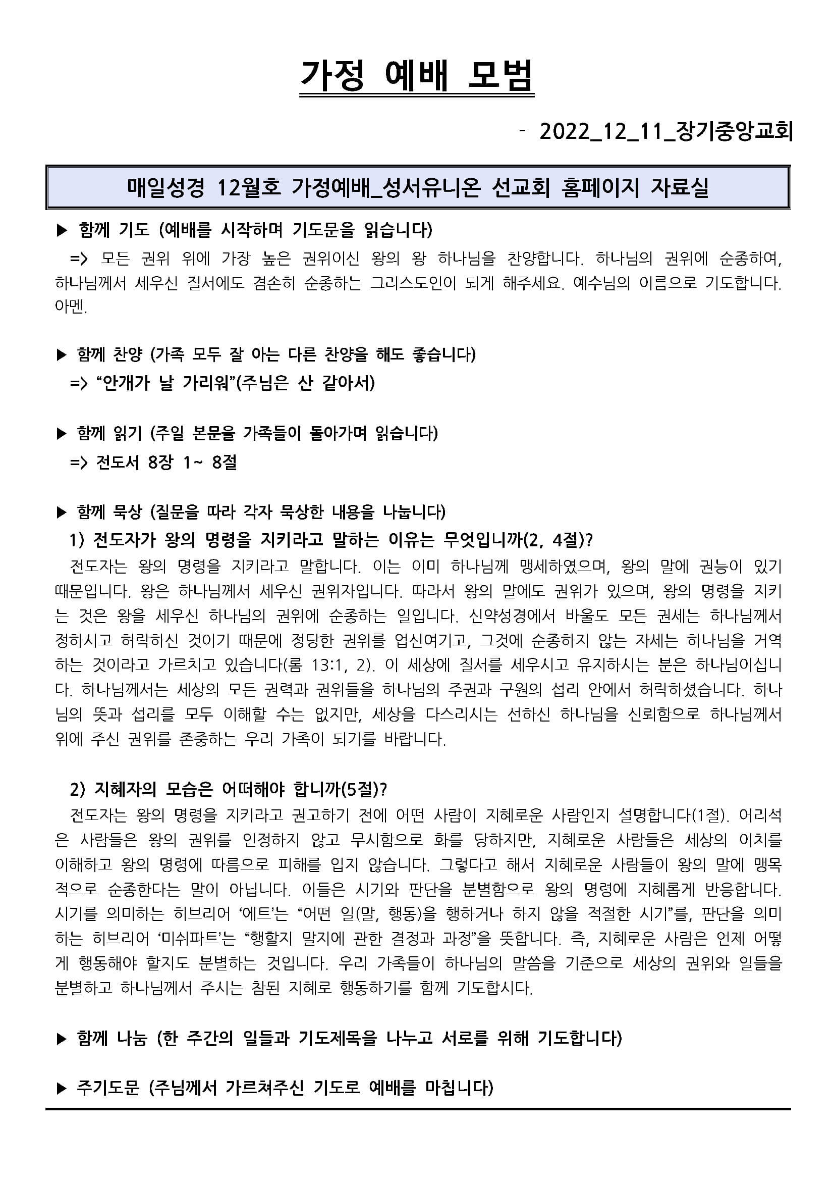 2022년 12월 11일 가정 예배 모범지