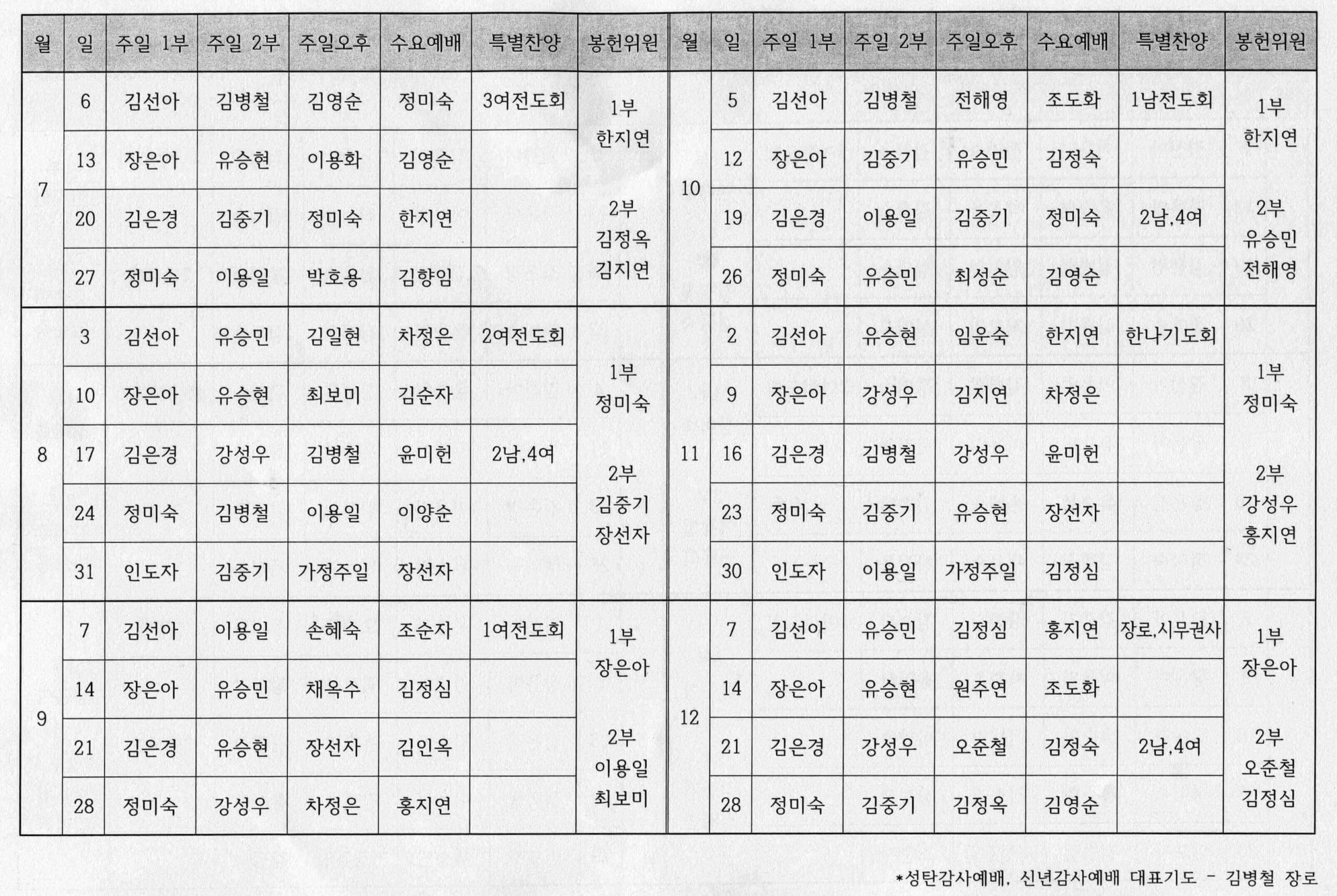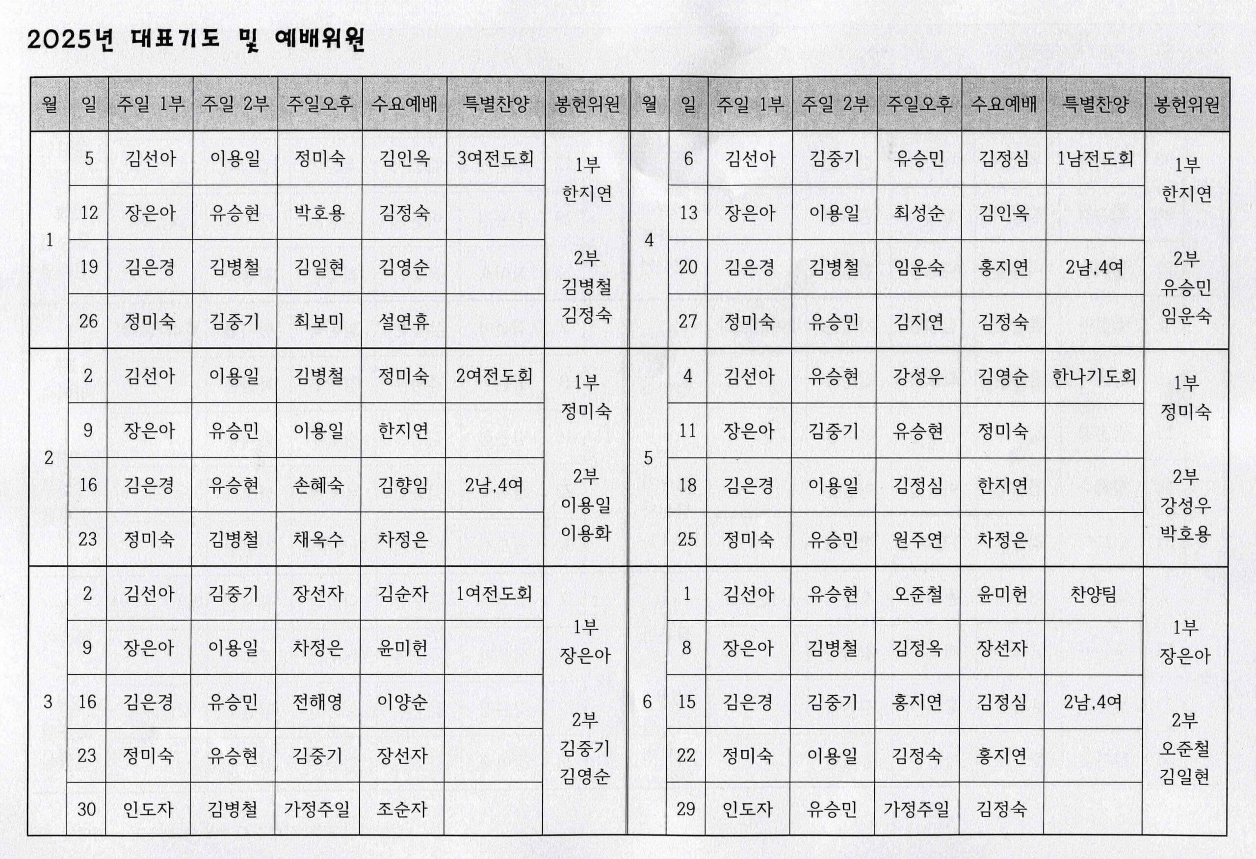 장기중앙교회 2025년 예배위원 안내 | 예배·찬양·봉헌 일정