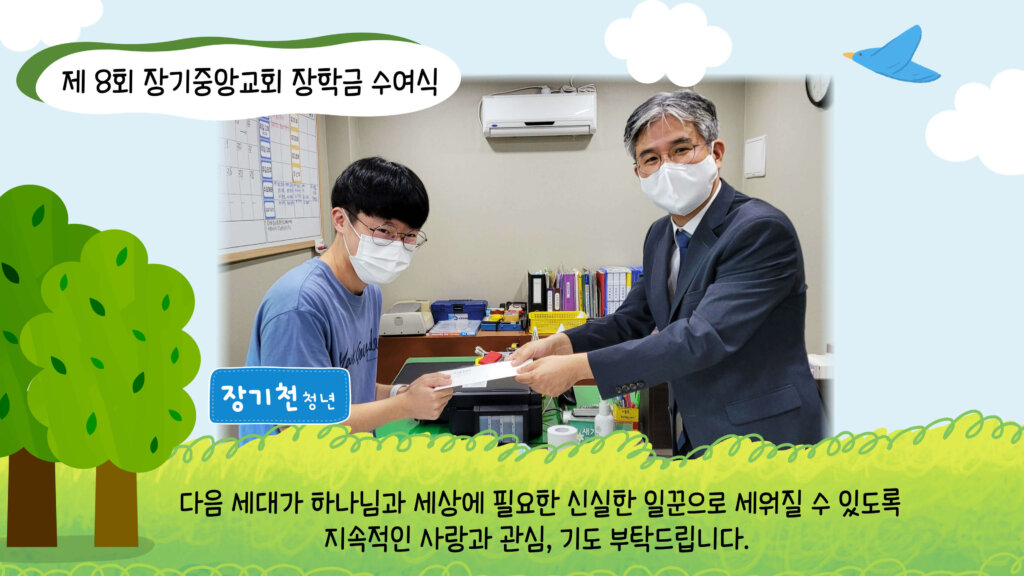 2021년 08월 15일2021년 08월 15일제 8회 장기중앙교회 장학금 수여by 장기중앙교회in 공지사항tags 장학금0 0 2021년 8월 15일 ‘제8회 장기중앙교회 장학금 수여식’이 진행되었으며, 장기천 청년에게 장학금을 수여했습니다. 장학기금 모금에 동참해 주신 성도들에게 감사드립니다. 앞으로도 다음 세대가 하나님과 세상에 필요한 신실한 일꾼으로 세워질 수 있도록 지속적인 사랑과 관심, 기도 부탁드립니다.