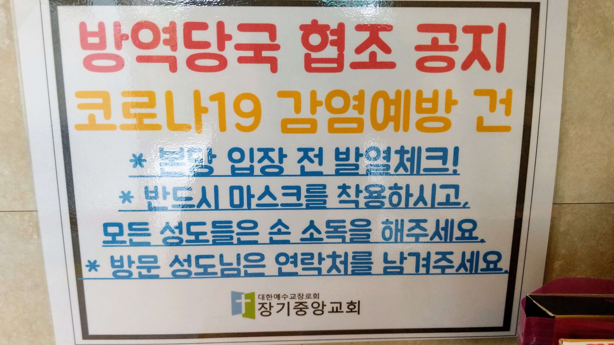 교회에서는 예배와 신앙 교육을 포기할 수는 없습니다. 하지만 교회는 이웃을 위해 그 어떤 곳보다 안전한 공간이어야 합니다. 장기중앙교회는 코로나 예방을 위해 철저한 방역수칙 준수(아이들의 참여 인원을 10명 이하로 제한, 예배실 출입구에서 발열 및 호흡기 증상 확인, 전원 마스크 착용, 예배 전후 소독 및 환기 실시 등, 지정 좌석제로 거리 두기 등 방역 수칙 지키기)를 하고 있습니다. 또한 접촉으로 인한 감염을 막기 위해 장갑 착용도 의무화하는 등 시설 특성에 맞게 자체적으로 방역조치를 고민하고 시행하고 있습니다.
