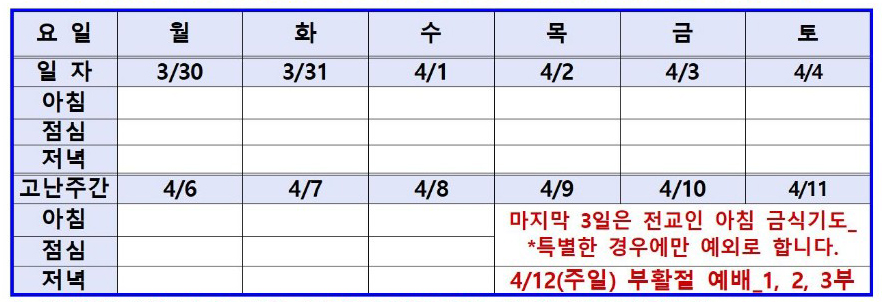 - 고난주간 특별새벽기도회는 에스더 금식기도로 대체합니다.