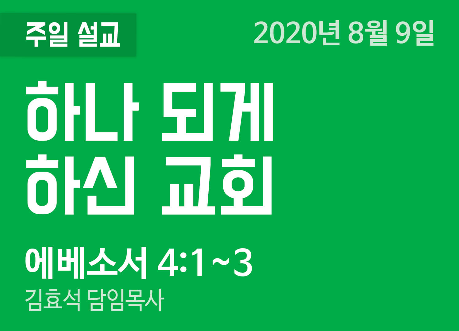 2020년 08월 09일하나 되게 하신 교회 Speaker: 장기중앙교회 In 주일 낮 예배Tags 에베소서WatchListen 대한예수교 장로회 장기중앙교회 2020년 8월 9일 주일 낮 예배 말씀 제목: 하나 되게 하신 교회 성경 본문: 에베소서 4장 1-3절 말씀 선포: 김효석 목사 (장기중앙교회 담임목사) 예배 주보 보기 에베소서 4장 1-3절 1 그러므로 주 안에서 갇힌 내가 너희를 권하노니 너희가 부르심을 받은 일에 합당하게 행하여 2 모든 겸손과 온유로 하고 오래 참음으로 사랑 가운데서 서로 용납하고 3 평안의 매는 줄로 성령이 하나 되게 하신 것을 힘써 지키라