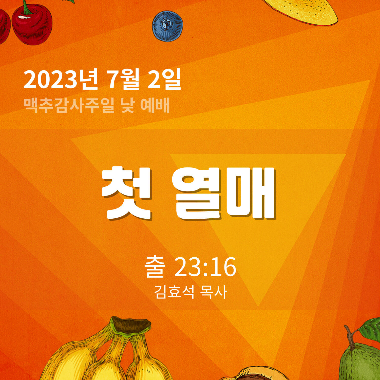 2023년 07월 02일첫 열매 Speaker: 장기중앙교회 In 맥추감사주일, 주일 낮 예배Tags 출애굽기Listen 대한예수교 장로회 장기중앙교회 2023년 7월 2일 주일 – 주일 낮 예배 말씀 제목: 첫 열매 성경 본문: 출애굽기 23장 16절 (구약성경 117면) 말씀 선포: 김효석 목사 (장기중앙교회 담임목사) 예배 주보 보기 출애굽기 23장 16절 (개역개정) 맥추절을 지키라 이는 네가 수고하여 밭에 뿌린 것의 첫 열매를 거둠이니라 수장절을 지키라 이는 네가 수고하여 이룬 것을 연말에 밭에서부터 거두어 저장함이니라