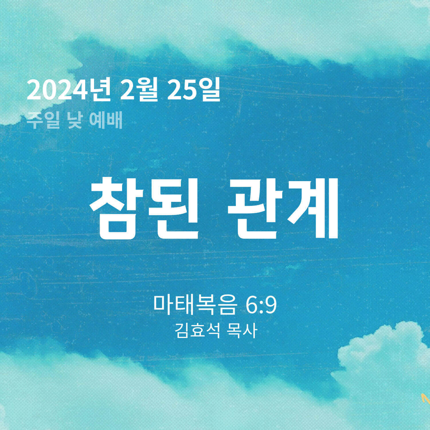 2024년 02월 25일참된 관계 Speaker: 장기중앙교회 In 주일 낮 예배Listen 2024년 2월 25일 주일 주일 낮 예배 말씀 제목: 참된 관계 성경 본문: 마태복음 6장 9절 (신약성경 8면) 말씀 선포: 김효석 목사 (장기중앙교회 담임목사) 예배 주보 보기 마태복음 6장 9절 (개역개정) 9 그러므로 너희는 이렇게 기도하라 하늘에 계신 우리 아버지여 이름이 거룩히 여김을 받으시오며