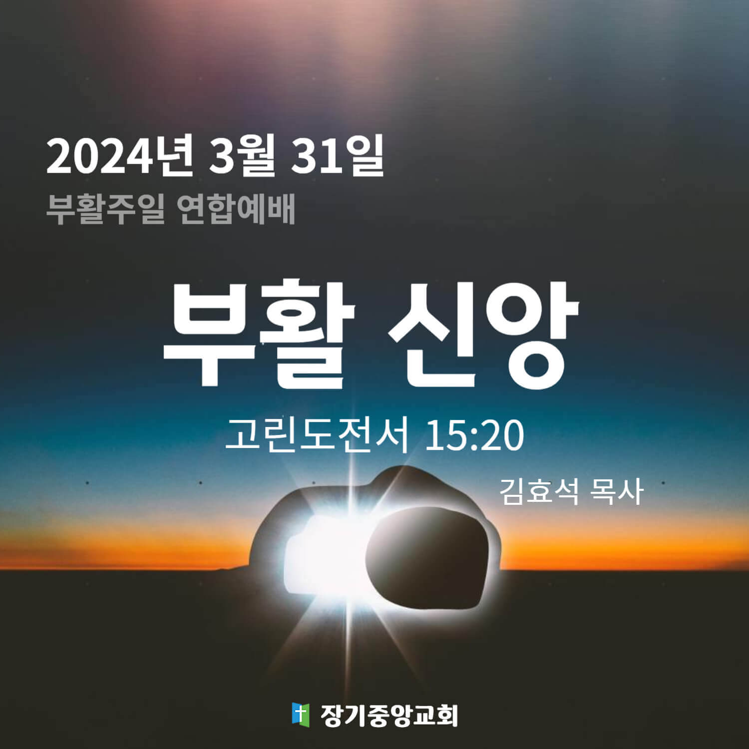 2024년 03월 31일부활 신앙 Speaker: 장기중앙교회 In 부활주일, 주일 낮 예배Tags 고린도전서Listen 2024년 3월 31일 부활주일 연합예배 말씀 제목: 부활 신앙 성경 본문: 고린도전서 15장 20절 (신약성경 283면) 말씀 선포: 김효석 목사 (장기중앙교회 담임목사) 예배 주보 보기 고린도전서 15장 20절 (개역개정) 20 그러나 이제 그리스도께서 죽은 자 가운데서 다시 살아나사 잠자는 자들의 첫 열매가 되셨도다